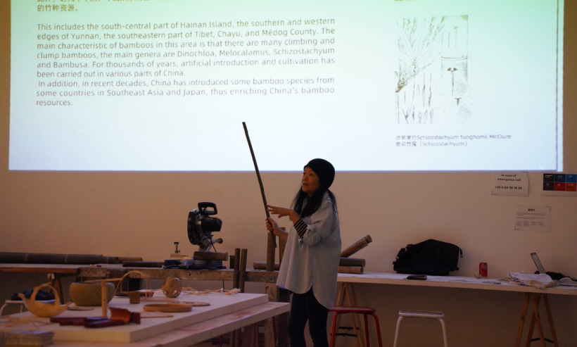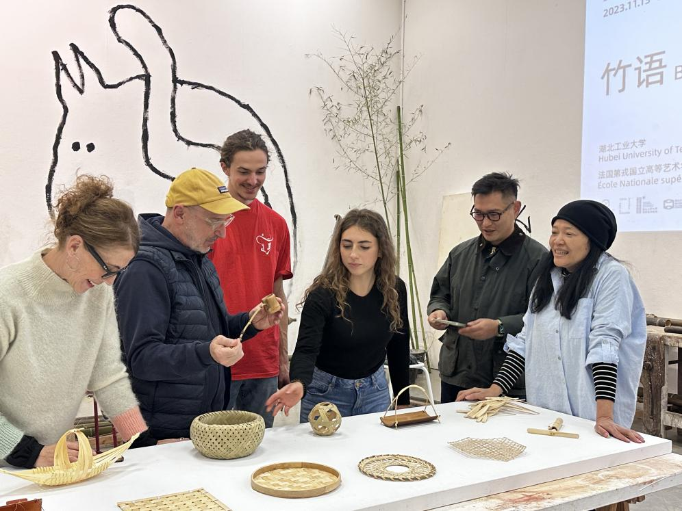 在学术交流期间,汪涛教授与熊威老师做“竹语”专题讲座,重点介绍了中国传统竹工艺,分享了以竹作为主要可持续材料的设计探索与未来展望。第戎国立高等艺术学院竹工艺专家Bertrand Chereau分享了竹子的特性,现场演示了劈竹、切割、打磨等关键步骤。这种跨文化的交流合作促进了思想的碰撞与融合,丰富了每个参与者的设计思维。