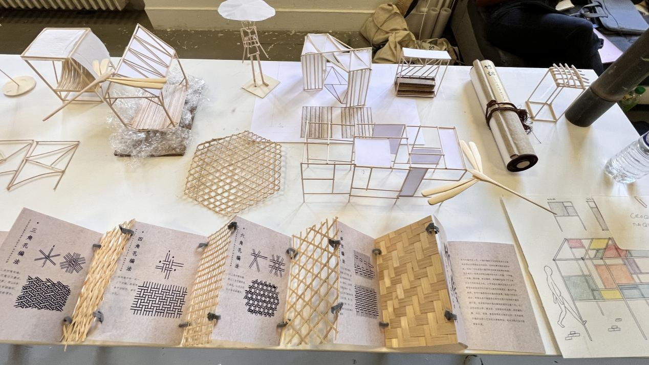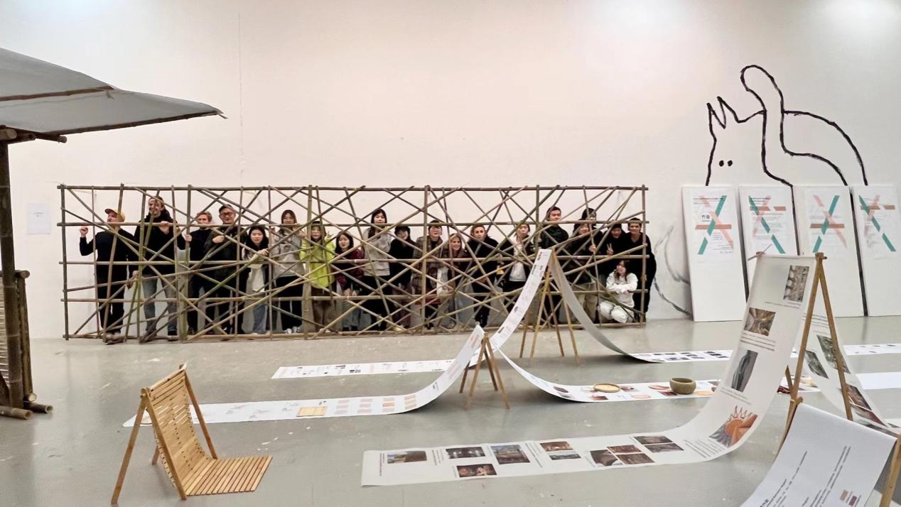 讲座之后,我校13名师生与法国第戎国立高等艺术学院教师Laurent Matras, Leila Toussaint, Hélène Robert,法国竹工艺专家Bertrand Chereau及12位法国学生共同完成了“竹语”主题工作坊及设计实践,中法两国的师生团队展开了紧密的合作与知识交流。他们分享经验、探讨技术问题,并共同解决设计中的挑战,最终展现精心制作的竹屋、竹拱门、竹隧道和竹穹顶四件大型公共空间应用实物,以及长卷设计平面展示等。团队纷纷表示,这次工作坊不仅是知识的交流,更是友谊的结晶。