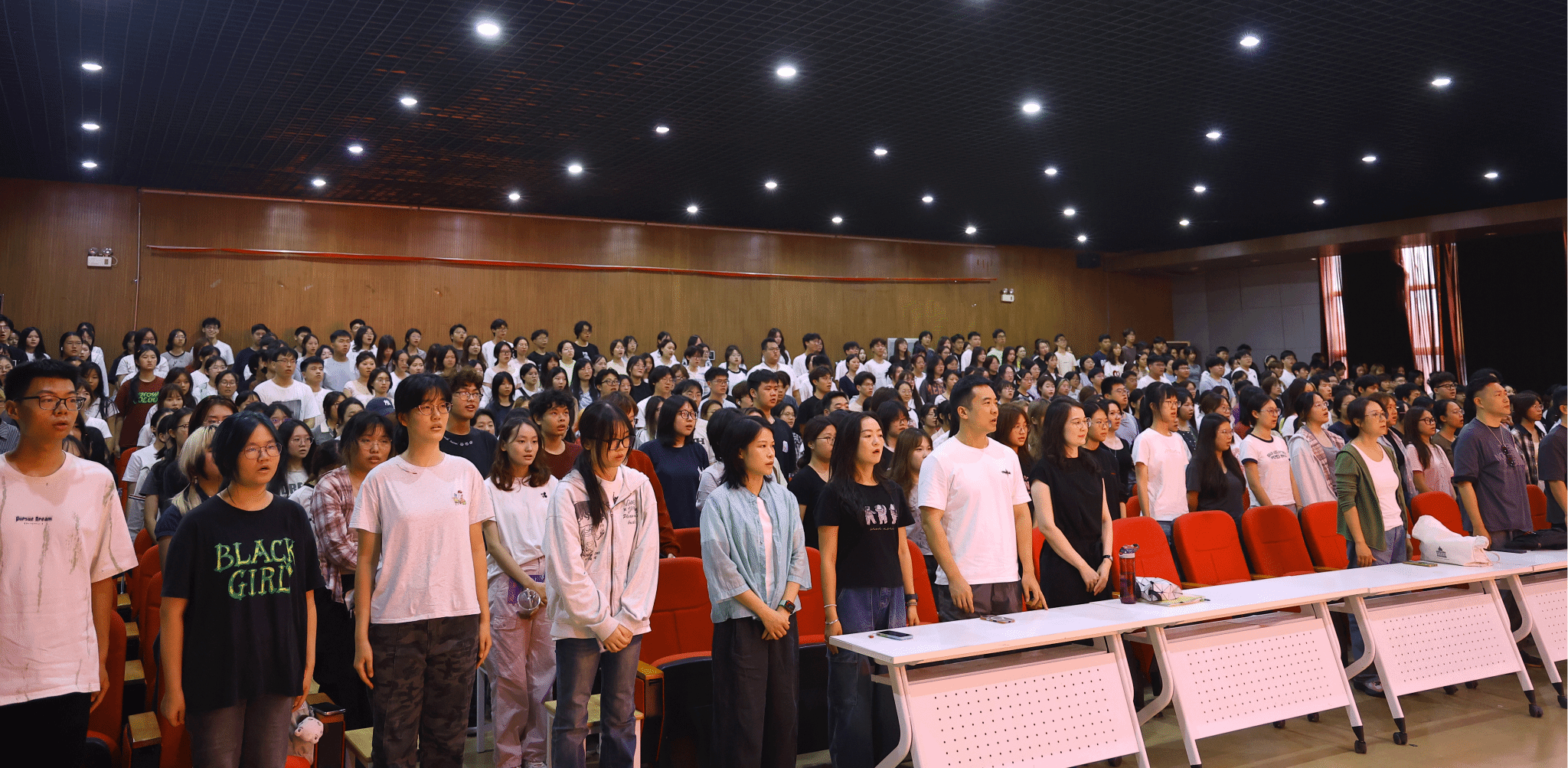开学典礼在庄严的国歌声中拉开帷幕。全体师生起立肃立,激昂的旋律在报告厅内回荡,爱国情怀在每个人心中悄然升腾,为这场迎新盛会奠定庄重而热烈的基调。