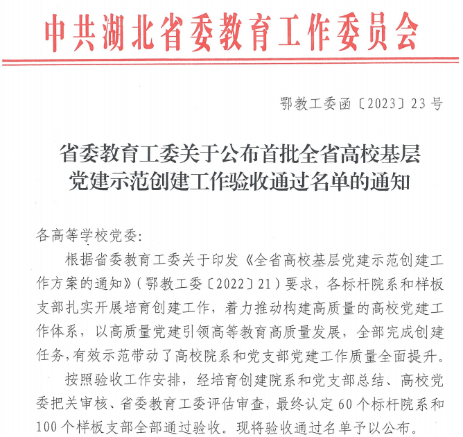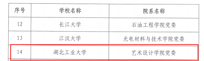 近日,中共湖北省委教育工作委员会公布了首批全省高校基层党建示范创建工作验收通过名单,经艺术设计学院党委自查总结、专家审核、学校鉴定并报省委教育工委评估审查,艺术设计学院党委作为首批湖北省党建工作标杆院系顺利通过验收。