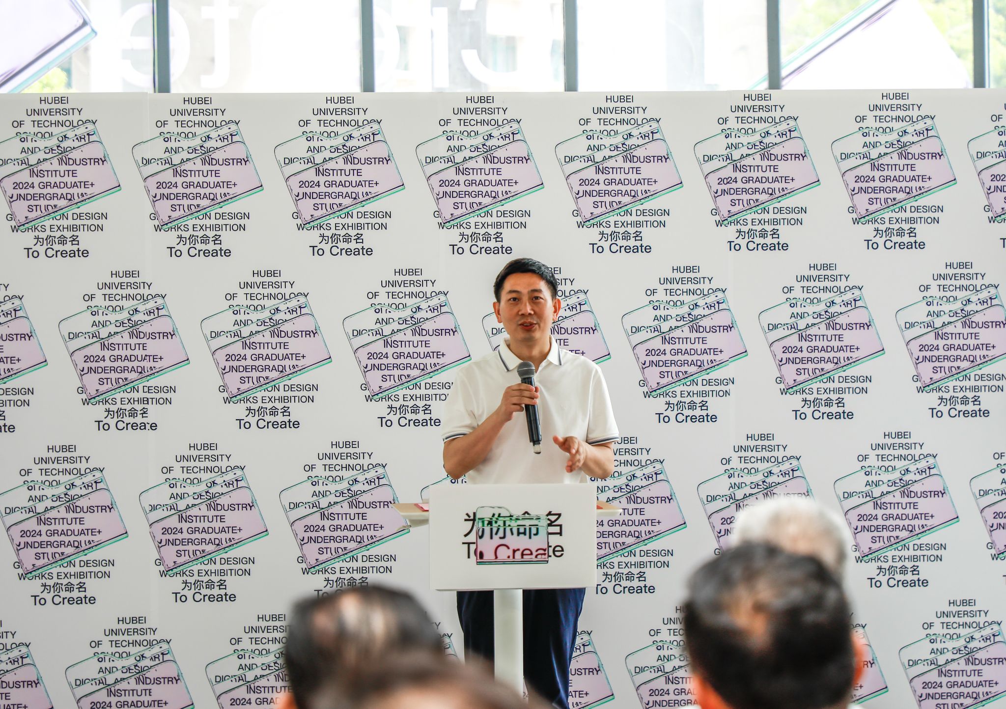 湖北省高等学校毕业生就业指导服务中心主任尹云波致辞,他对学院在过往46年的教育成果表示赞扬,对湖工大设计的品牌表示高度认可,希望毕业生们持续为中国梦的美丽图案添上湖工大设计的鲜亮色彩。