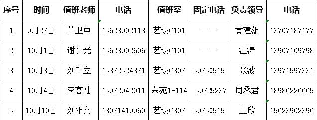 4.学院安排假期值班,遇有特殊情况,可拨打值班老师或带班领导电话进行报告。附:学院假期值班安排表:
