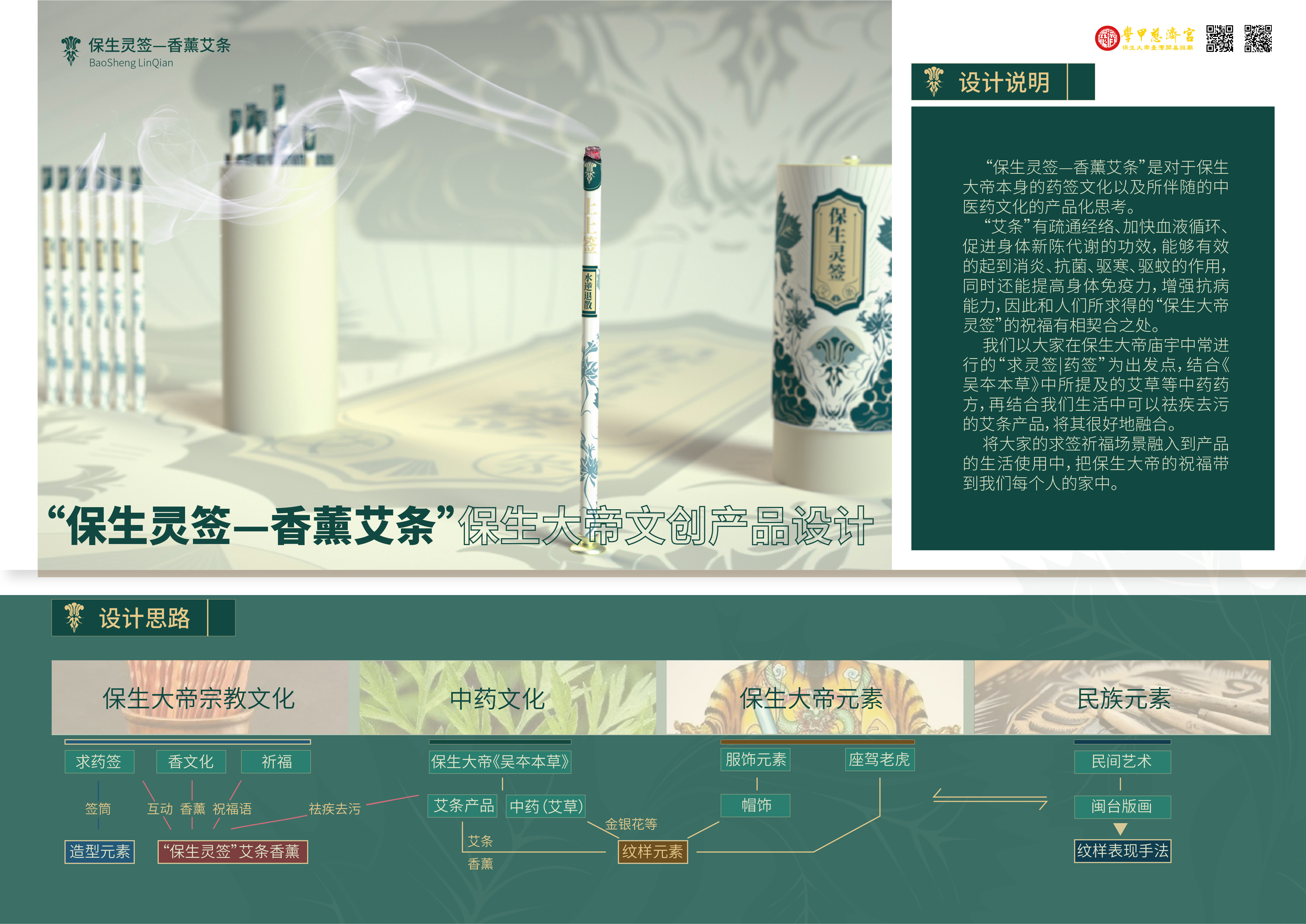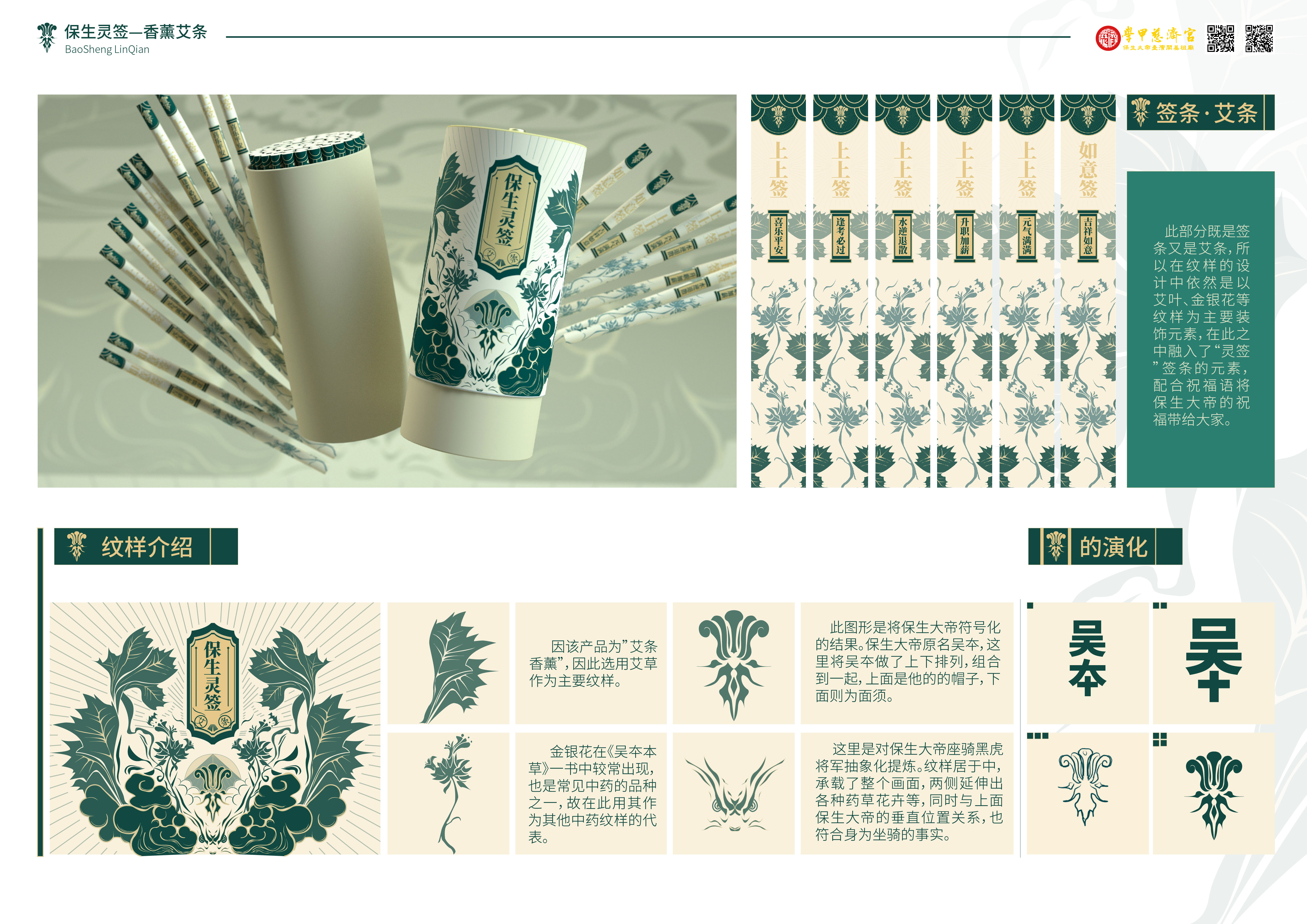 我们以大家在保生大帝庙宇中常进行的“求灵签|药签”为出发点,结合《吴夲本草》中所提及的艾草等中药药方,再结合我们生中可以祛疾去污的艾条产品,将其很好地融合。将大家的求签祈福场景融入到产品的生活使用中,把保生大帝的祝福带到我们每个人的家中。