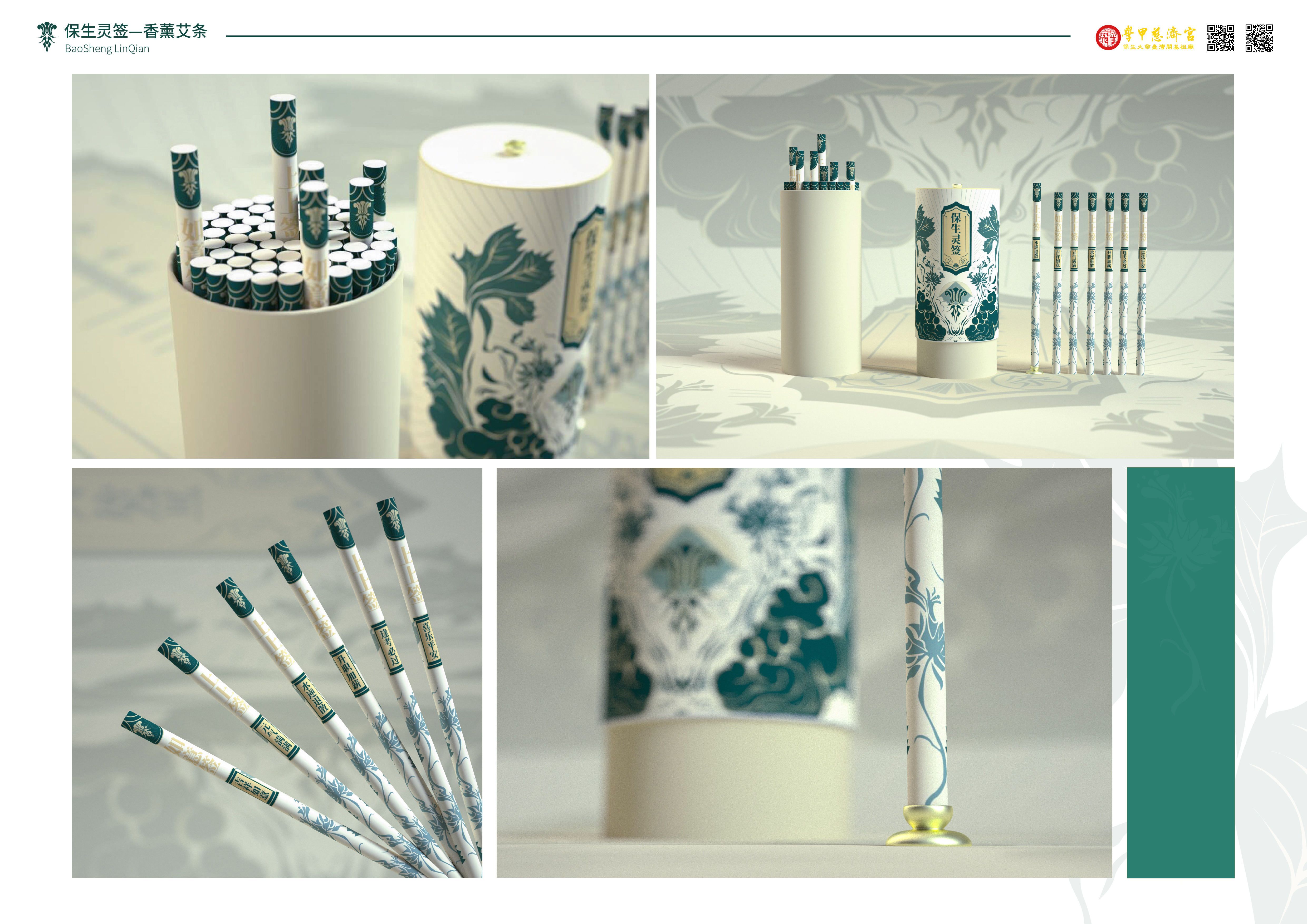 “保生灵签—香薰艾条”是对于保生大帝本身的药签文化以及所伴随的中医药文化的产品化思考。“艾条”有疏通经络、加快血液循环、促进身体新陈代谢的功效,能够有效的起到消炎、抗菌、驱寒、驱蚊的作用,同时还能提高身体免疫力,增强抗病能力,因此和人们所求得的“保生大帝灵签”的祝福有相契合之处。
