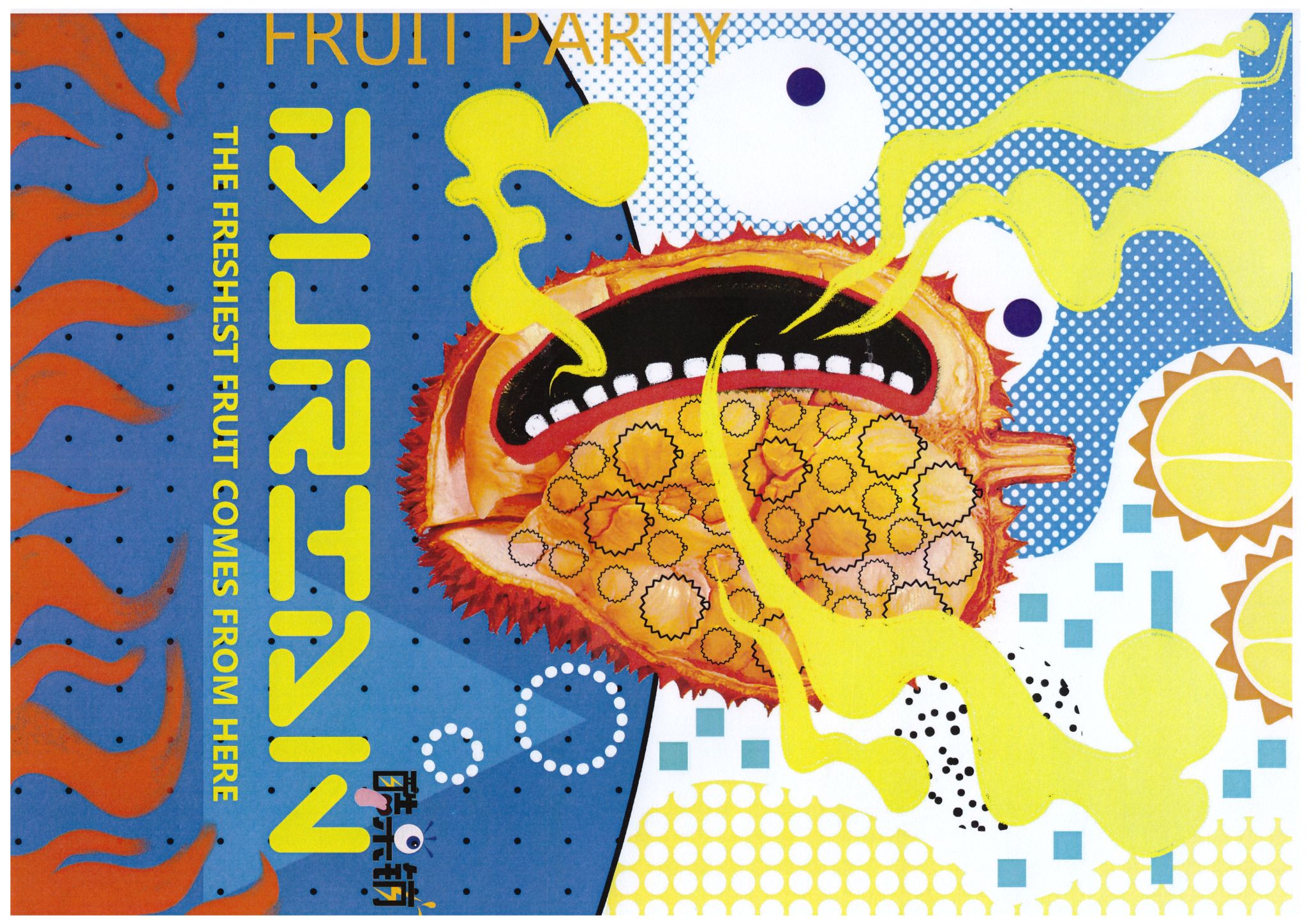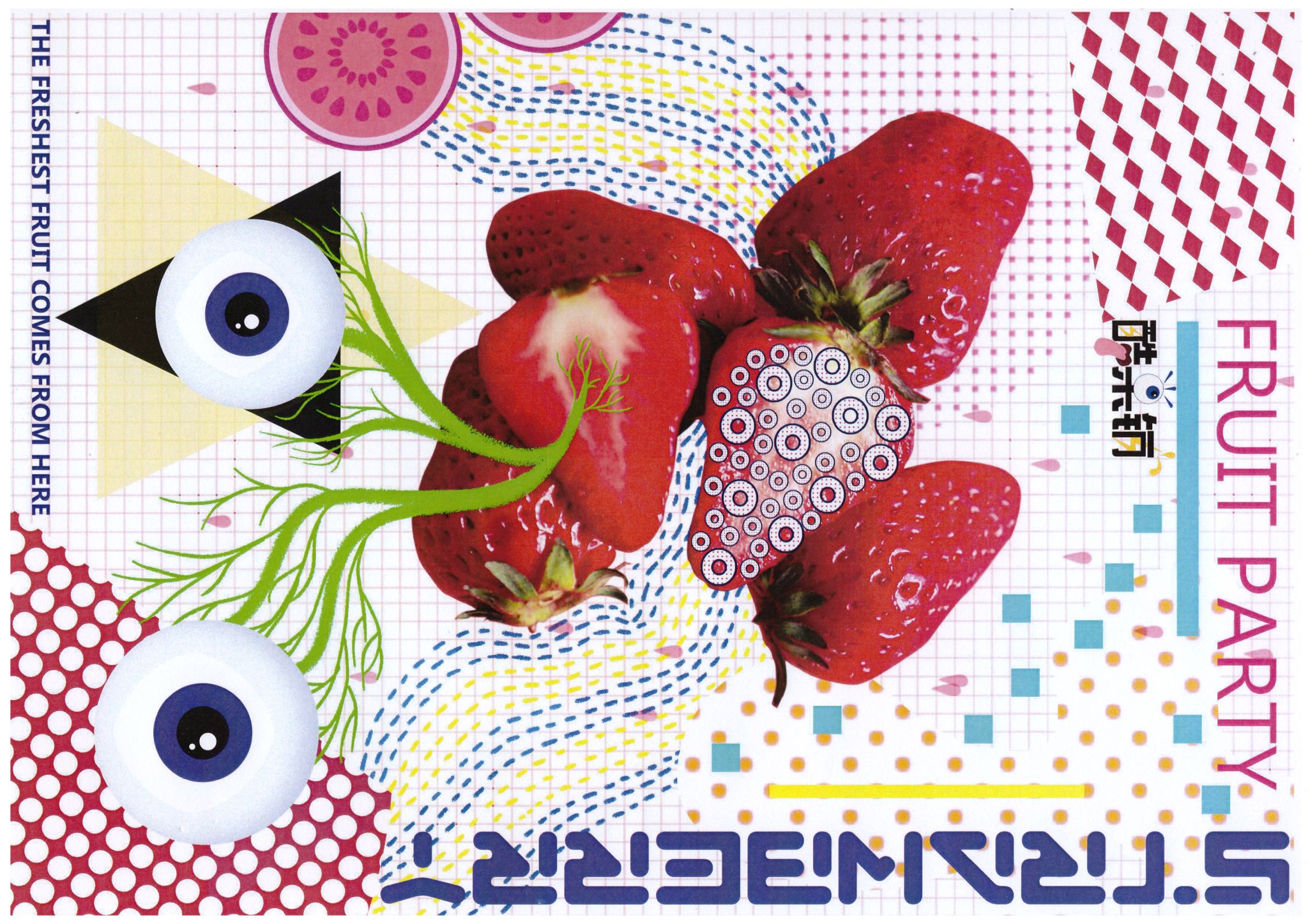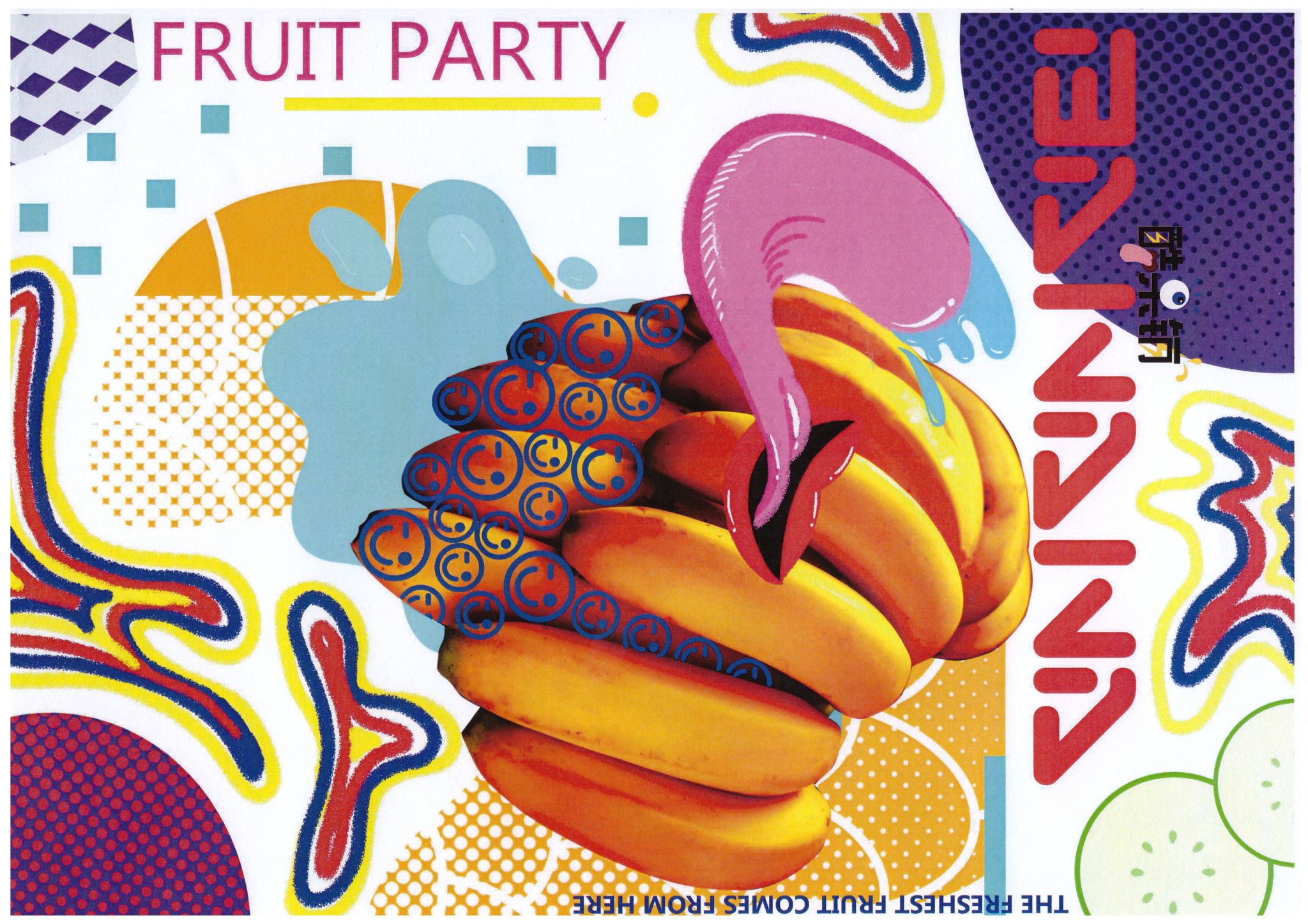 该设计为水果店“酷果铺”的海报设计,主题为【FRUIT PARTY】,将榴莲、草莓、香蕉三种,具有一定代表性的水果作为主体物,灵活运用人的嗅觉、味觉、视觉等感官元素,并结合其各自的果物特征,把榴莲的气味和牙齿、草莓的颜色和眼睛、香蕉的口感和舌头进行创作。作品为一个系列,整体运用波普风格,色彩靓丽,鲜明的对比反差,有着强烈的视觉冲击力,跳跃的元素和活泼的氛围能充分地展现出水果诱人的美味和清甜的芳香。