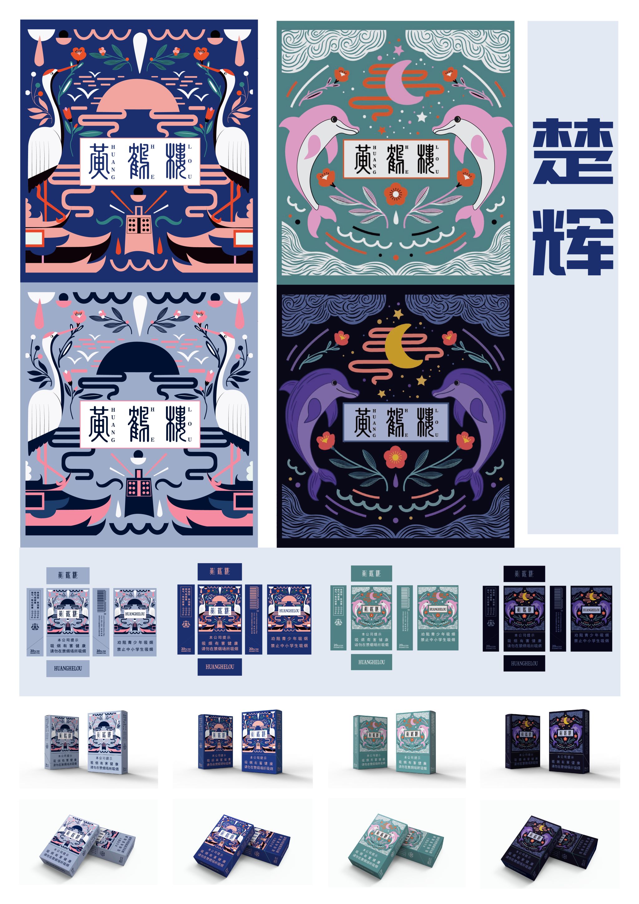 此系列黄鹤楼烟包分为日月两款。日款烟包主要由湖北特有的黄鹤、黄鹤楼、以及编钟等元素组成;月款烟包主要由湖北的珍稀动物白鳍豚、武汉市的市花梅花以及祥云和江水等元素组成。湖北无论是在历史文化上还是地理环境上都具有很大的优势,其发展潜力就像太阳和月亮发出的光一样,具有强大的力量;而湖北无论是在白天还是夜晚,都光芒四射,散发着它的魅力。