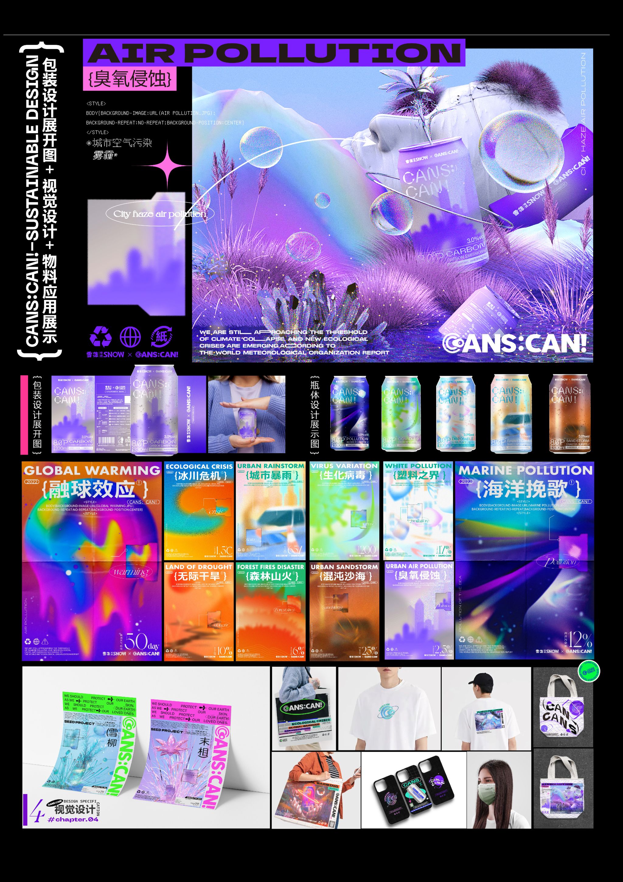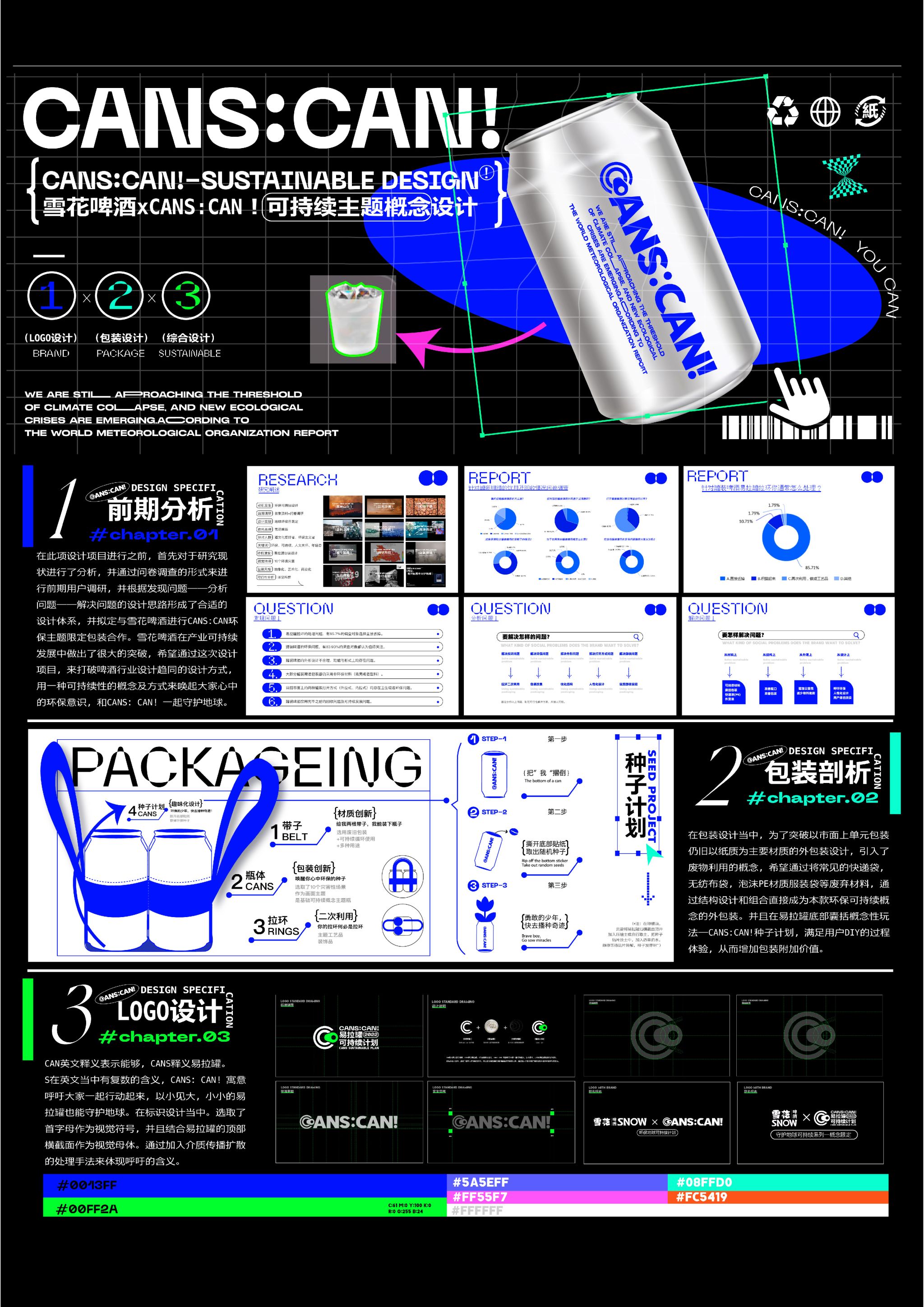 作品分为:CANS:CAN!品牌标识LOGO设计、雪花啤酒联名易拉罐主题环保视觉包装设计、以及环保主题衍生品设计和包装结构创新设计、AR交互。品牌设计:依据CANS:CAN!作为视觉符号进行设计。包装设计:选取了十个备受关注的环境问题进行切入。创新设计:AR图案交互,通过扫描瓶身图案使消费者身临其境。种植计划:易拉罐二次利用。