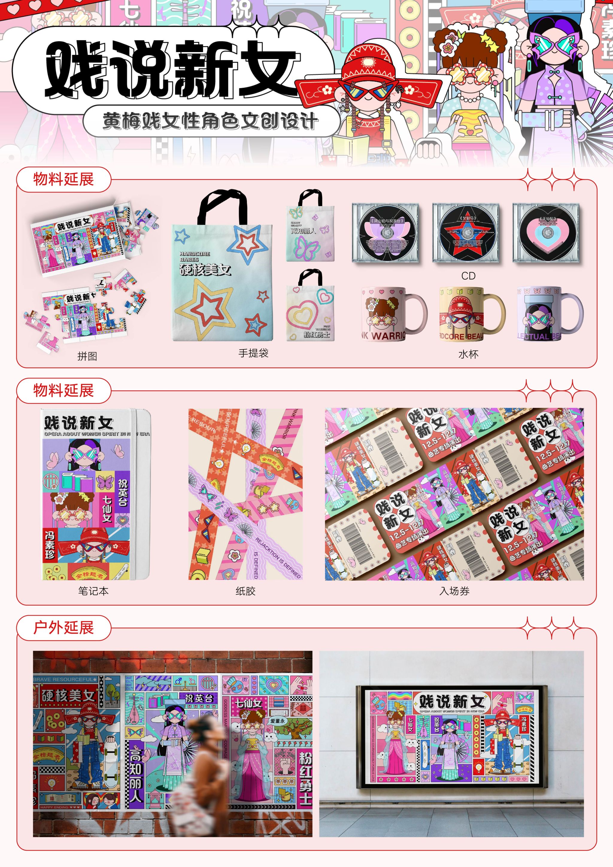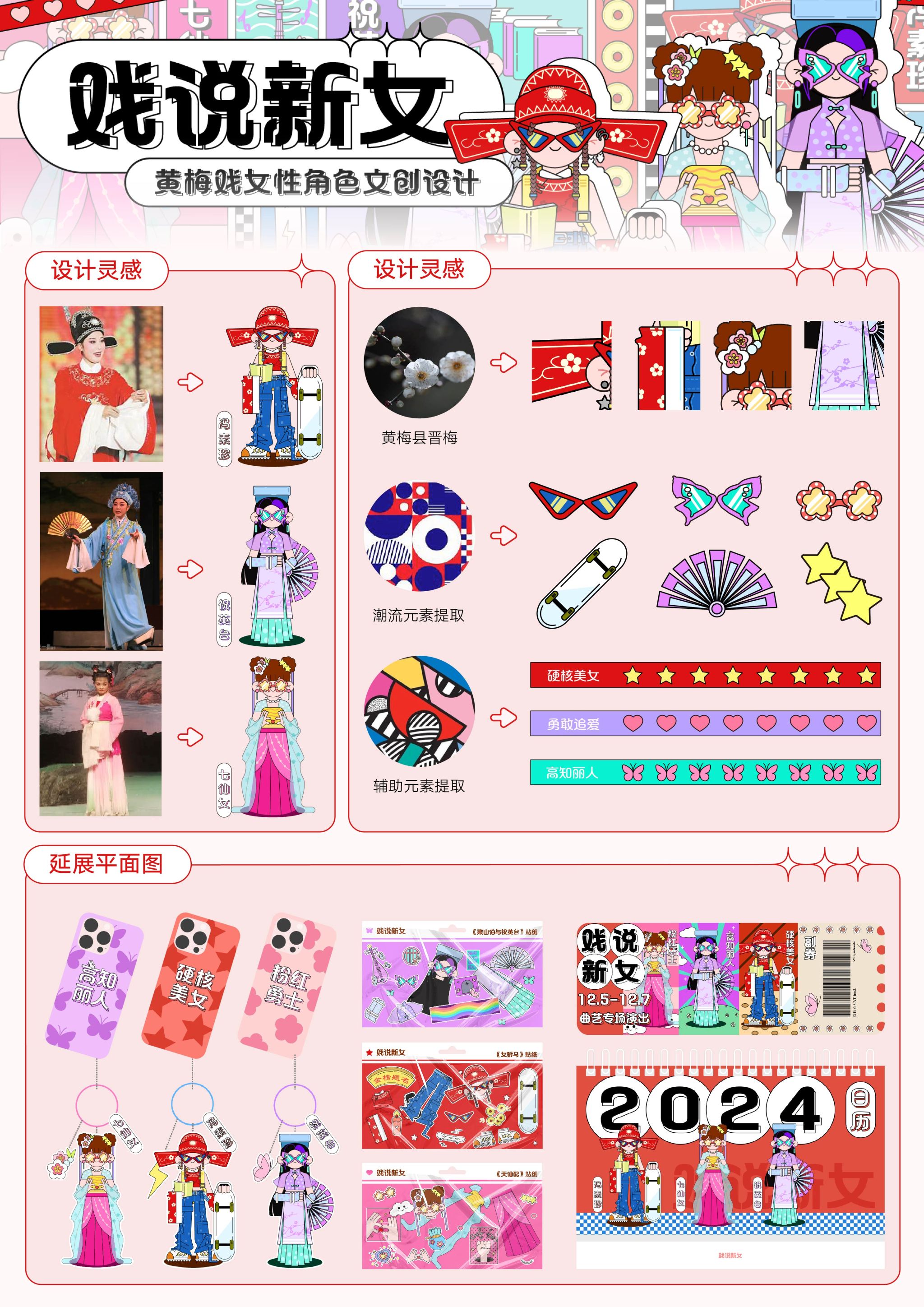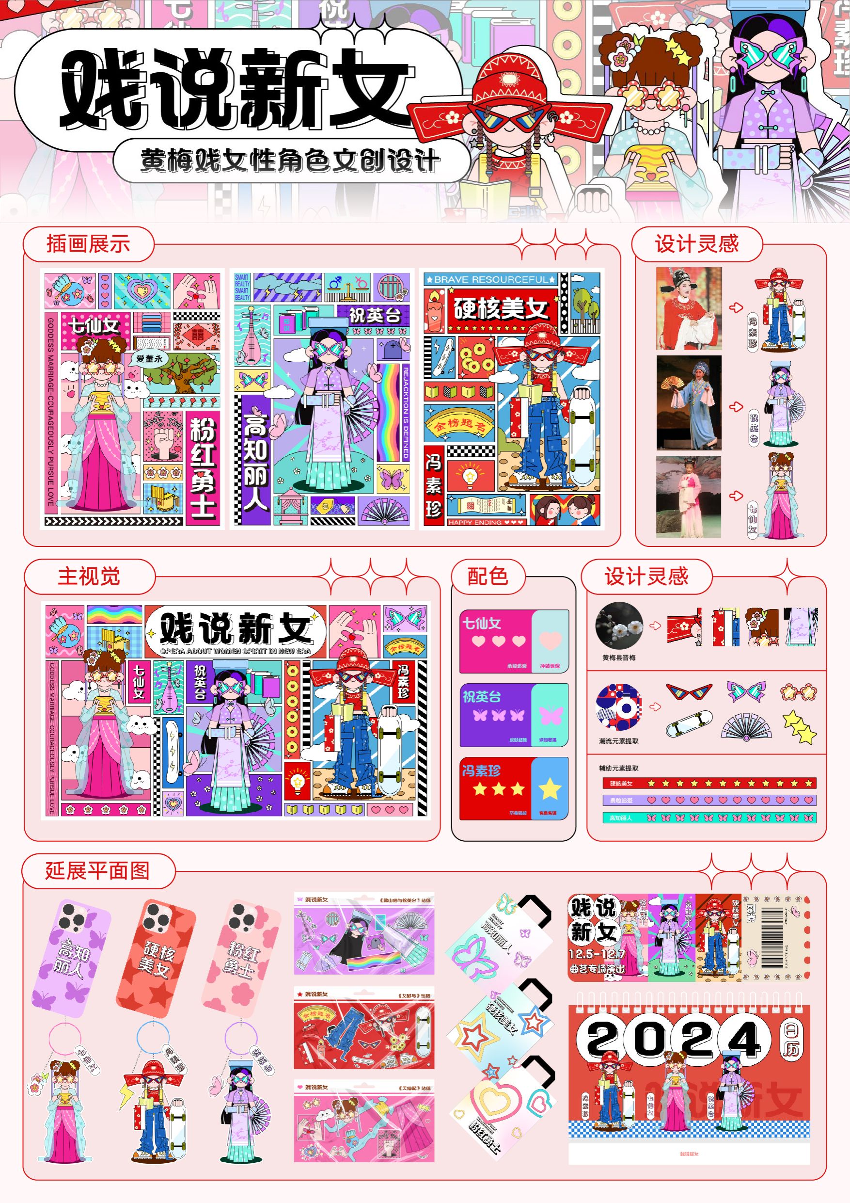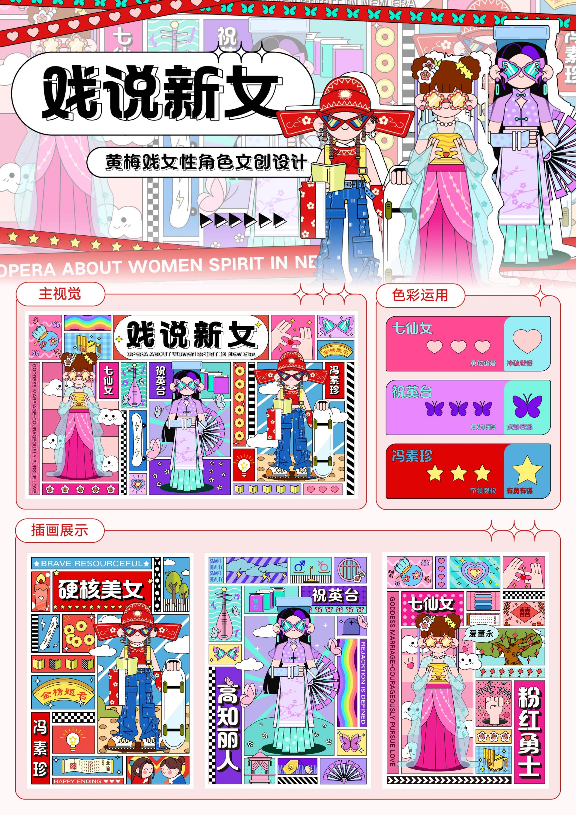 《戏说新女》是关于湖北黄梅戏女性角色的文化创新设计。灵感来源于黄梅戏三大经典戏剧曲目《天仙配》、《女驸马》、《梁山伯与祝英台》。从戏中提炼出七仙女冯素珍、祝英台三位女旦角色身上具备的新时代女性特质,塑造出粉红勇士,硬核美女,高知丽人三位潮酷女旦形象;利用孟菲斯插画的特点,营造出强对比度的视觉效果。我们期望通过新的视觉形式和对女性力量与精神的关注,吸引更多年轻群体了解黄梅戏这一国家级非物质文化遗产。