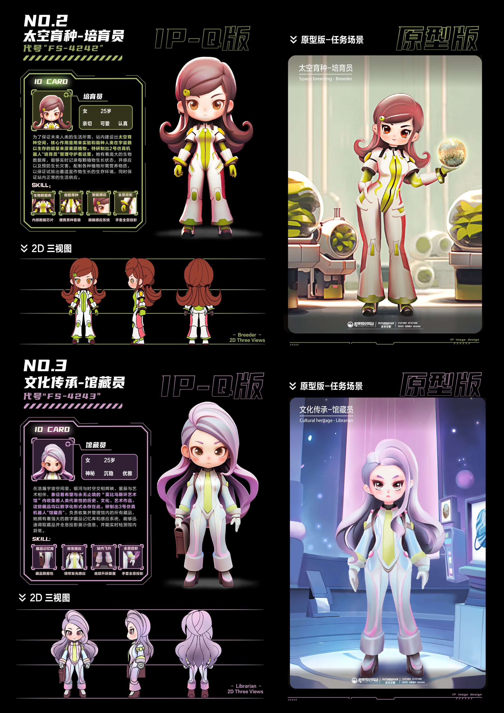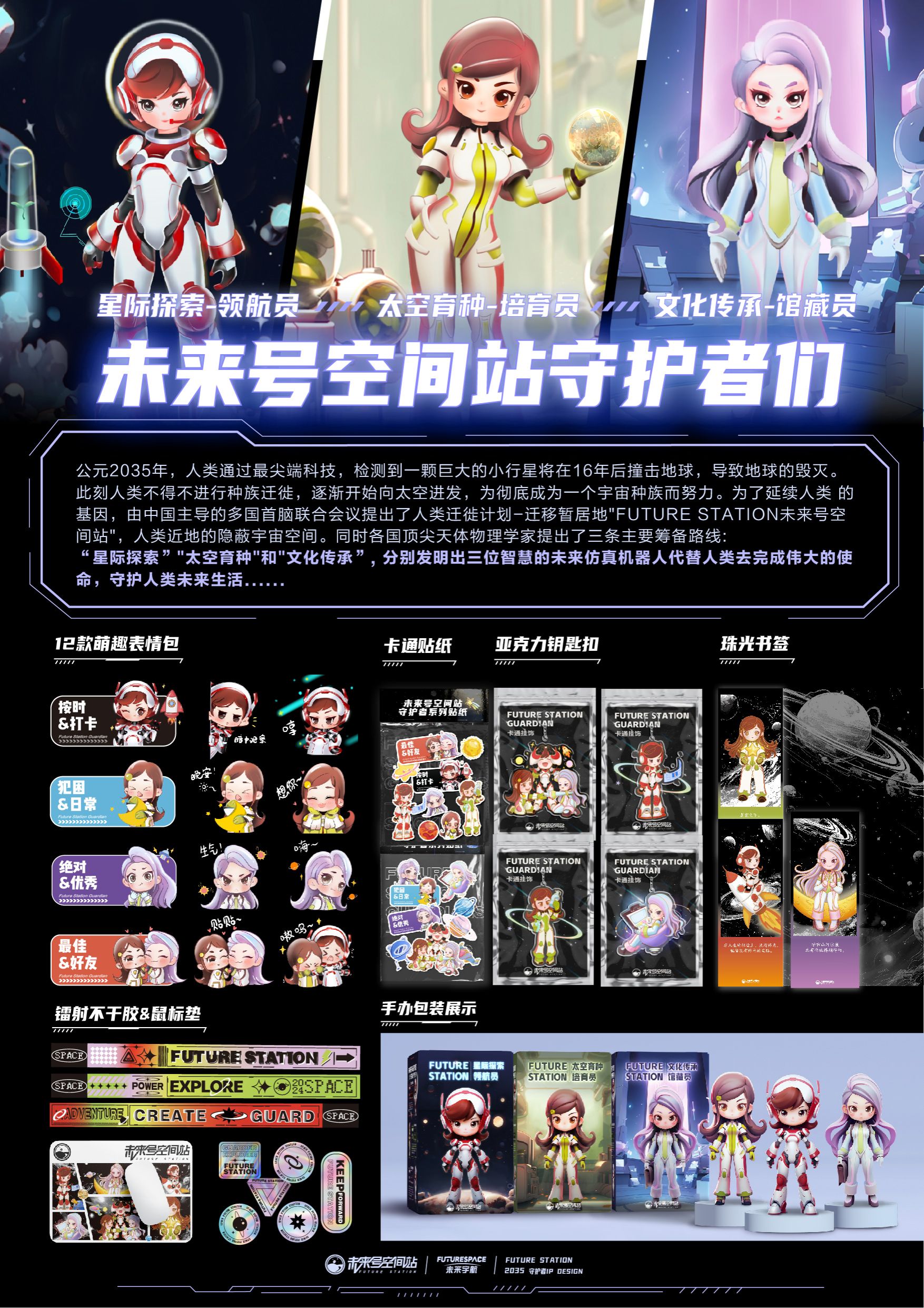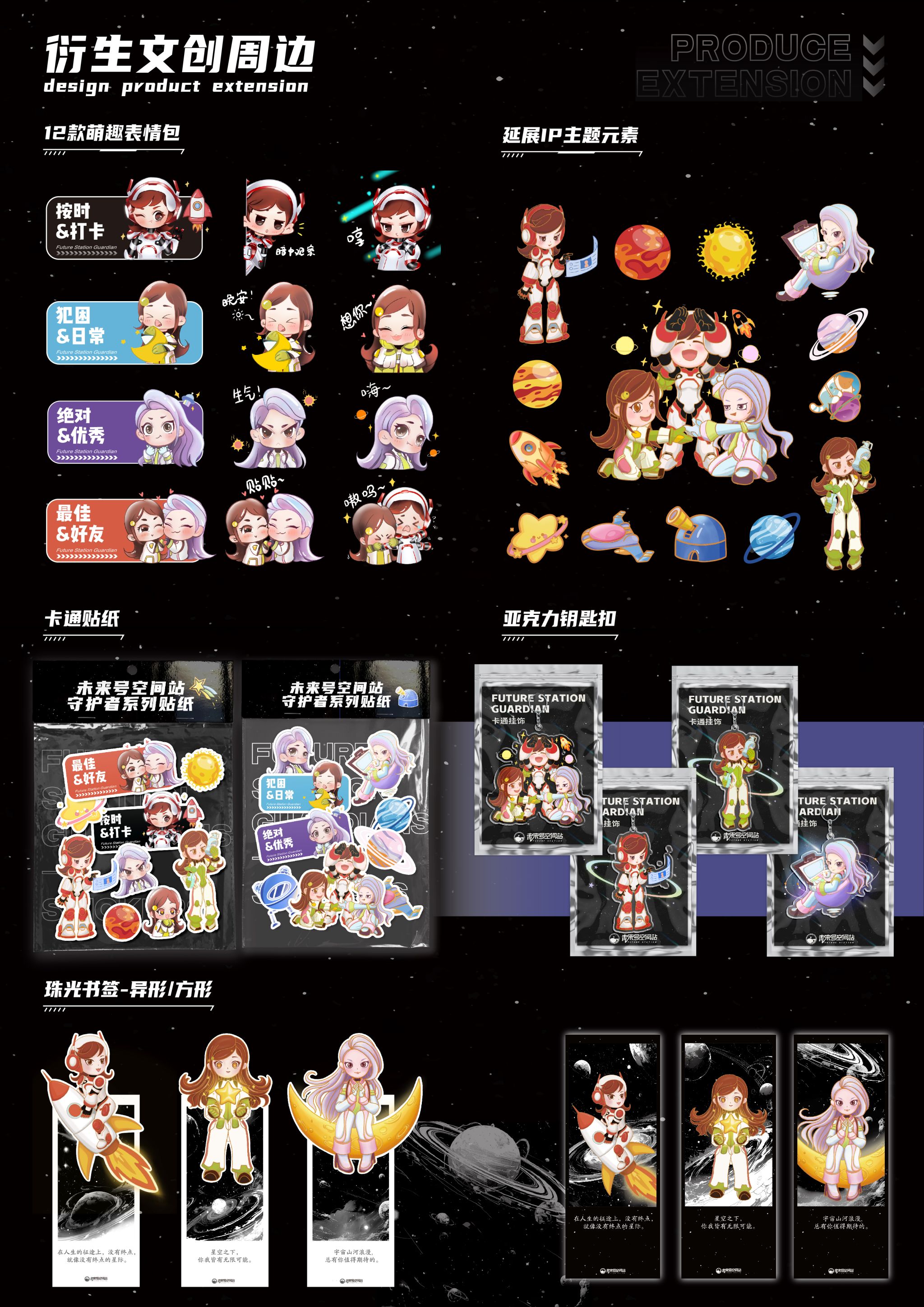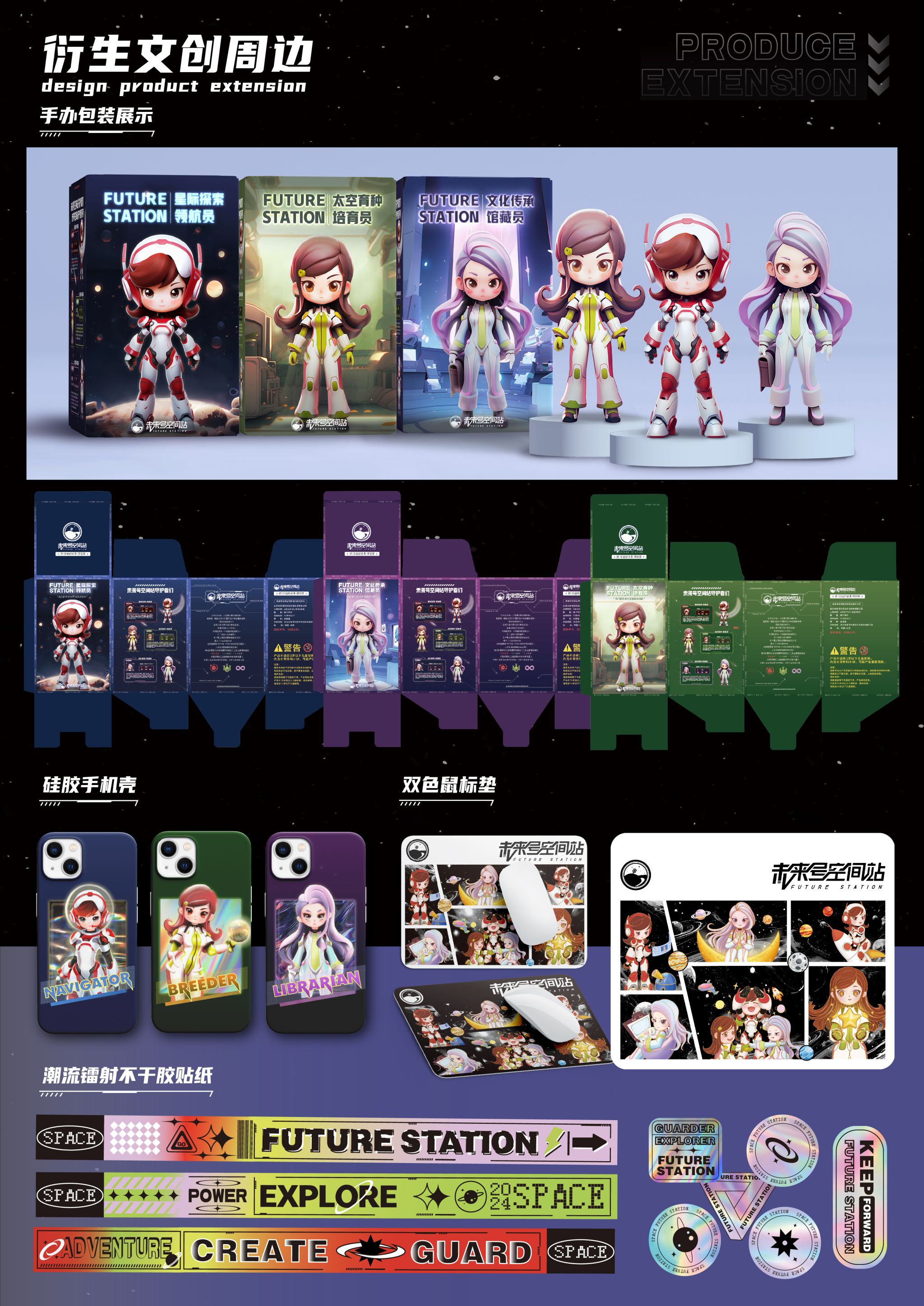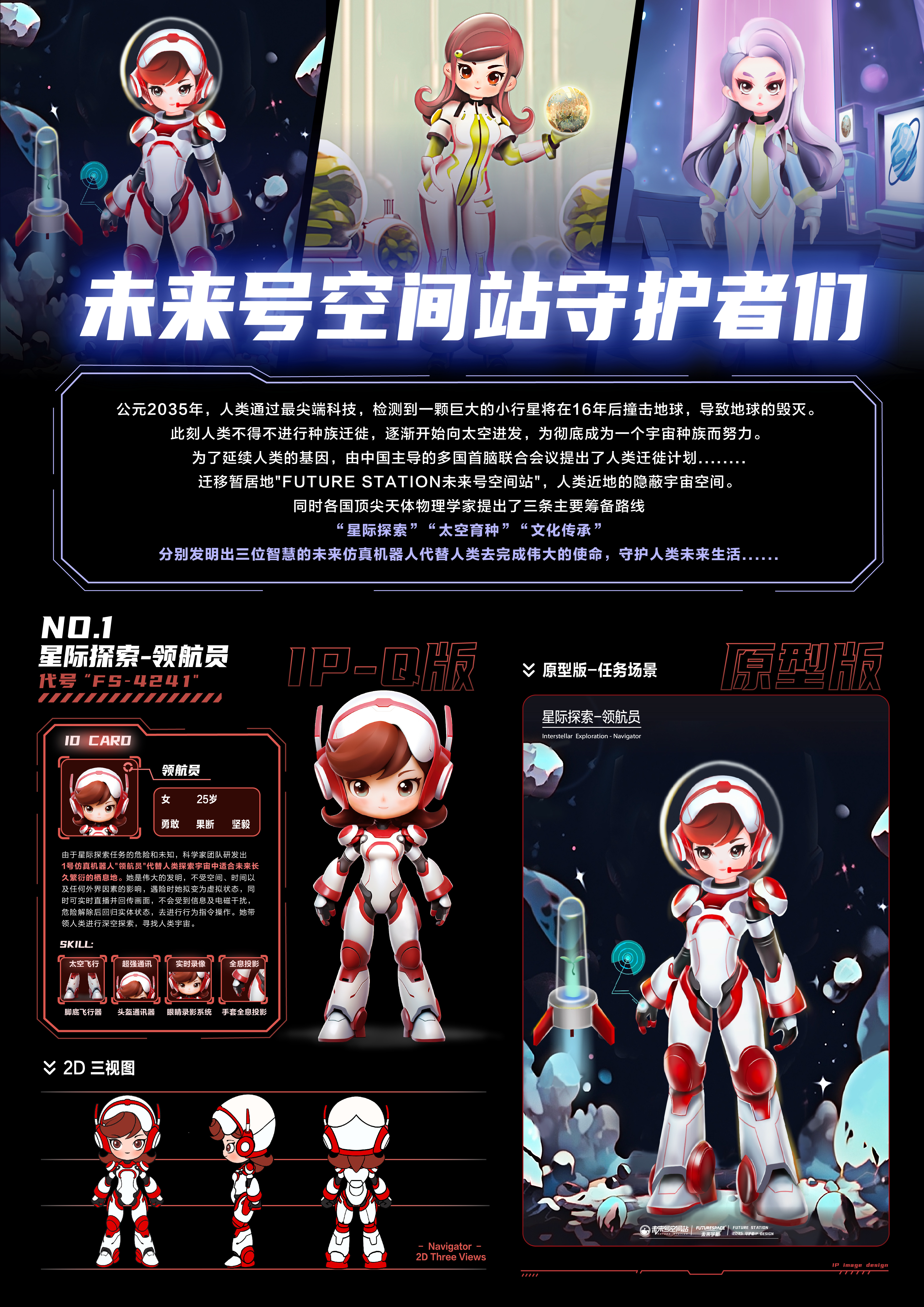 “未来号空间站”是未来宇航公司旗下的太空文创潮流品牌,在IP热环境下 推出《未来号空间站守护者》IP形象是品牌形象宣传的必然需求。此IP设计 以品牌的元宇宙世界观的三条未来任务线“星际探索”“太空育种”“文化 传承”为出发点,打造出三个代替人类完成伟大使命的仿真机器人,它们代 表着未来科技的无限和未来人类生存的希望......