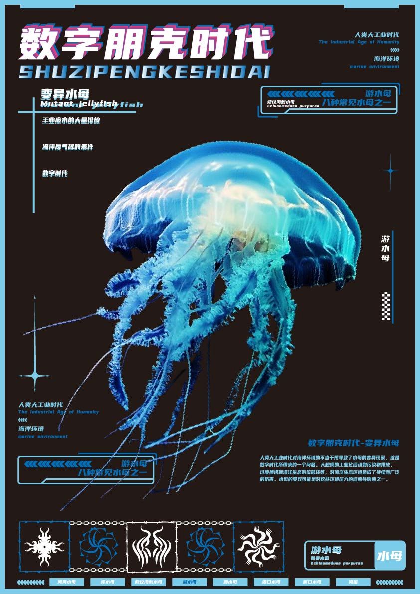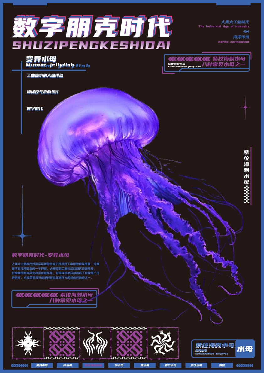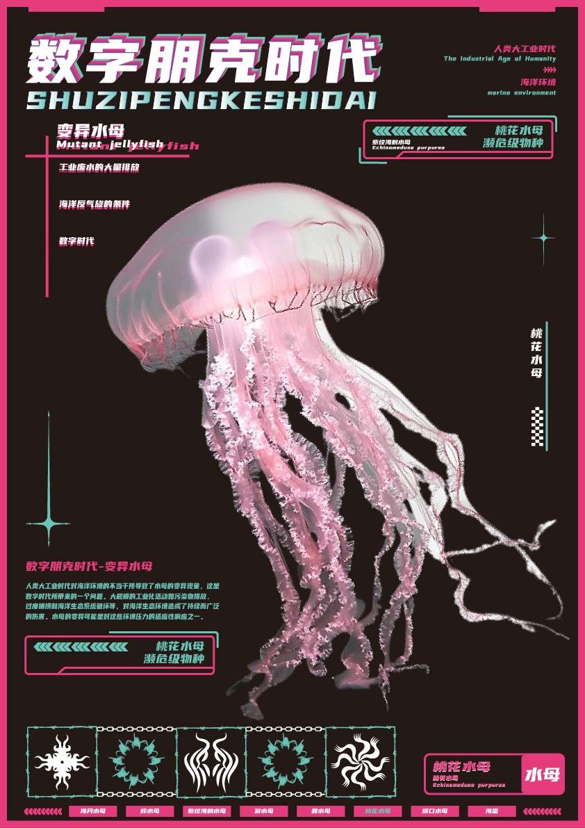 人类大工业时代对海洋环境的不当干预导致了水母的变异现象,这是数字时代所带来的一个问题。大规模的工业化活动如污染物排放、过度捕捞和海洋生态系统破坏等,对海洋生态环境造成了持续而广泛的伤害。数字朋克时代系列海报以“泛滥”、“濒危水母”的角度出发,分别选取,紫纹海刺水母、游水母和桃花水母为代表。总结了水母泛滥导致海洋被污染的原因,意在呼吁人类保护海洋环境,保护人类家园。