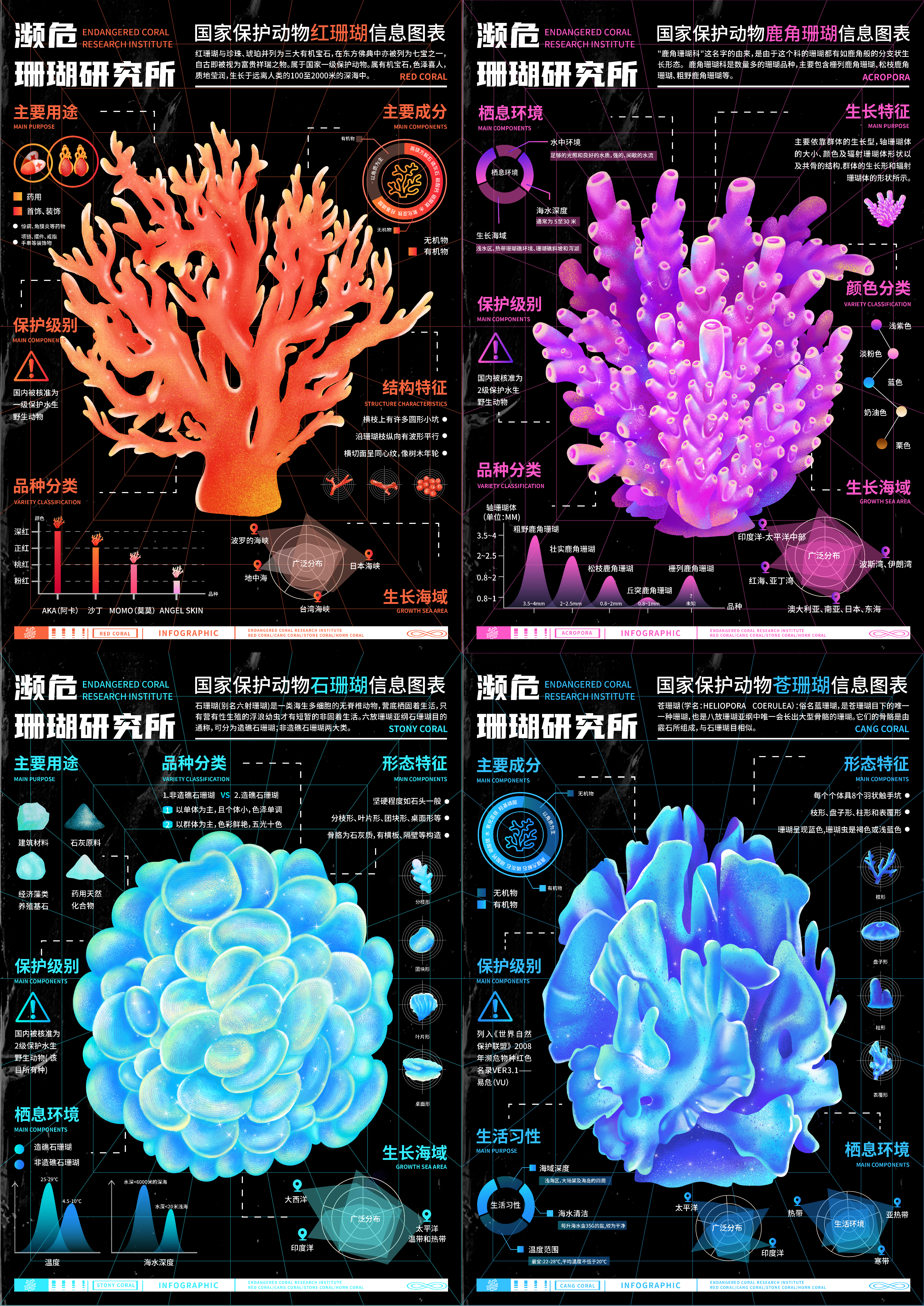 如果没有珊瑚,海岸线将会被侵蚀掉,影响渔获量、影响整个气候环境。向大家科普宣传关于濒危珊瑚群的知识和呼吁大家关注和保护珊瑚,引发大家的同理心是必要的,我们需要严肃对待这一问题。人与自然的可持续发展是必然之路,珊斑对于海洋来说,是一个很重要的存在,对于我们来说也是重要的存在。设计以濒危珊瑚为触点反映海洋污染的现状,以数字艺术的表现手法,将珊瑚白化的过程做成动态信息图表,更直观地让人们了解到海洋污染对珊瑚带来的危害,并呼吁人们了解珊瑚知识,带动对珊瑚死亡的相关思考。