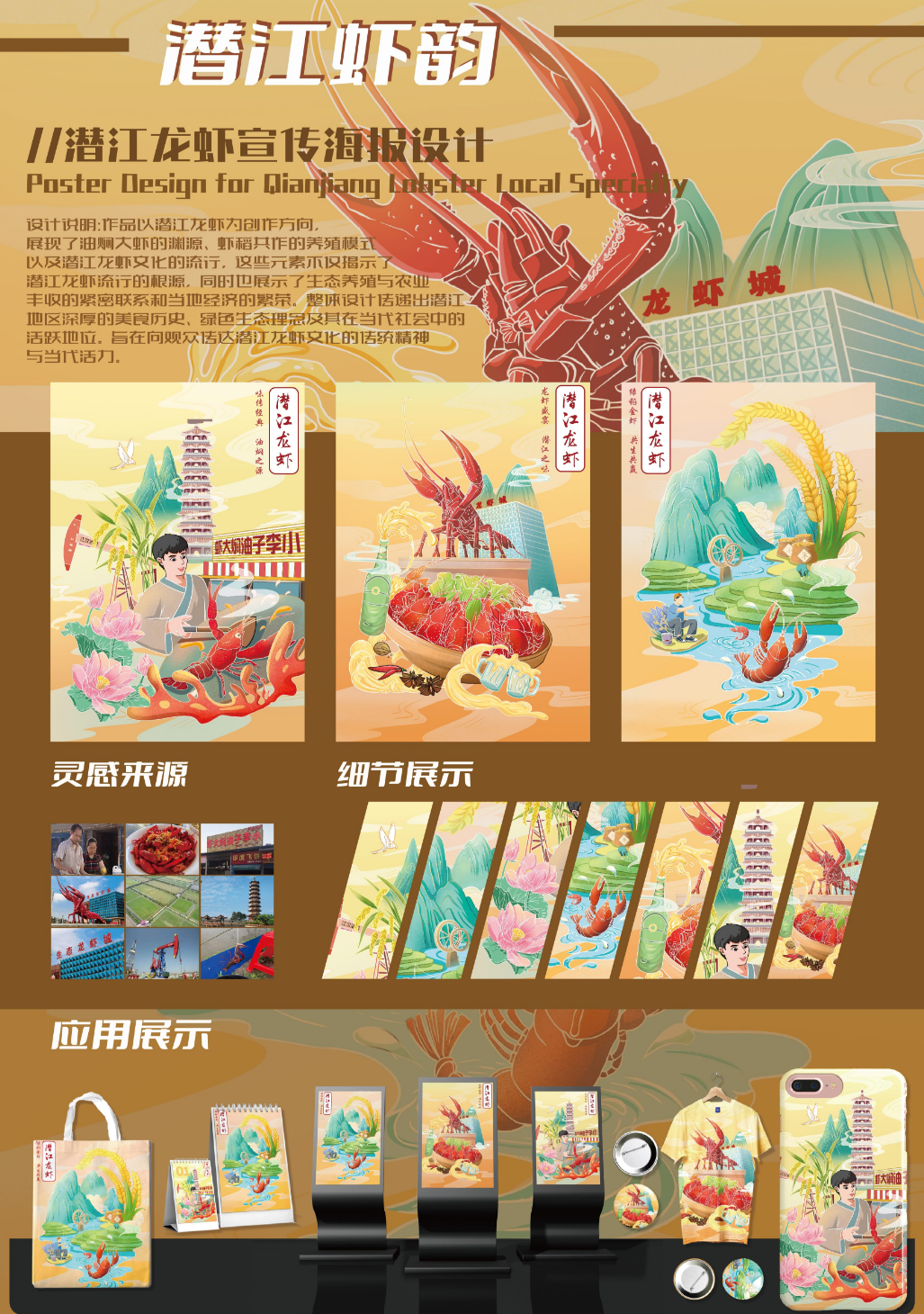 作品以潜江龙虾为创作方向,展现了油焖大虾的渊源、虾稻共作的养殖模式以及潜江龙虾文化的流行,这些元素不仅揭示了潜江龙虾流行的根源,同时也展示了生态养殖与农业丰收的紧密联系和当地经济的繁荣。整体设计传递出潜江地区深厚的美食历史、绿色生态理念及其在当代社会中的活跃地位。旨在向观众传达潜江龙虾文化的传统精神与当代活力。
