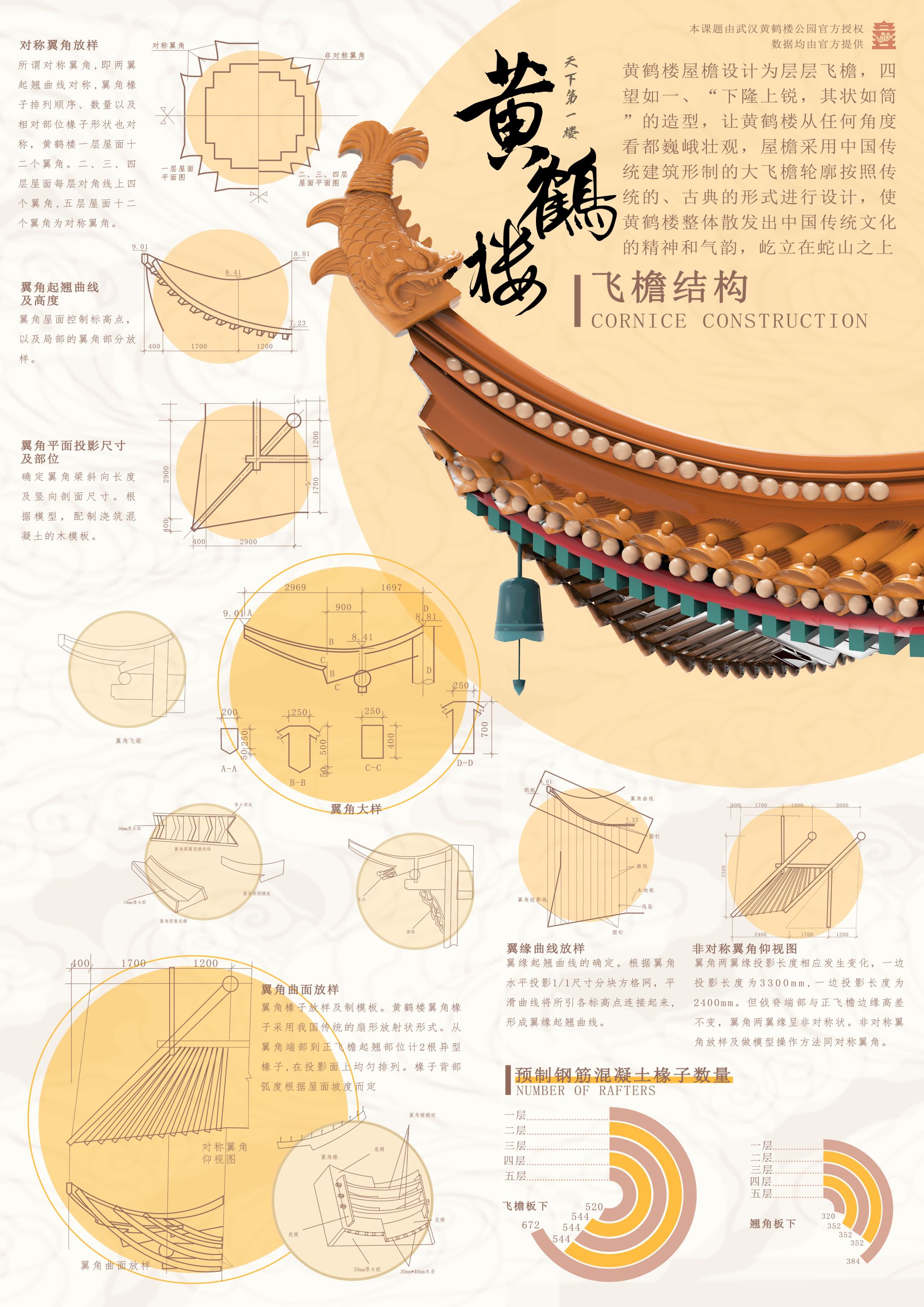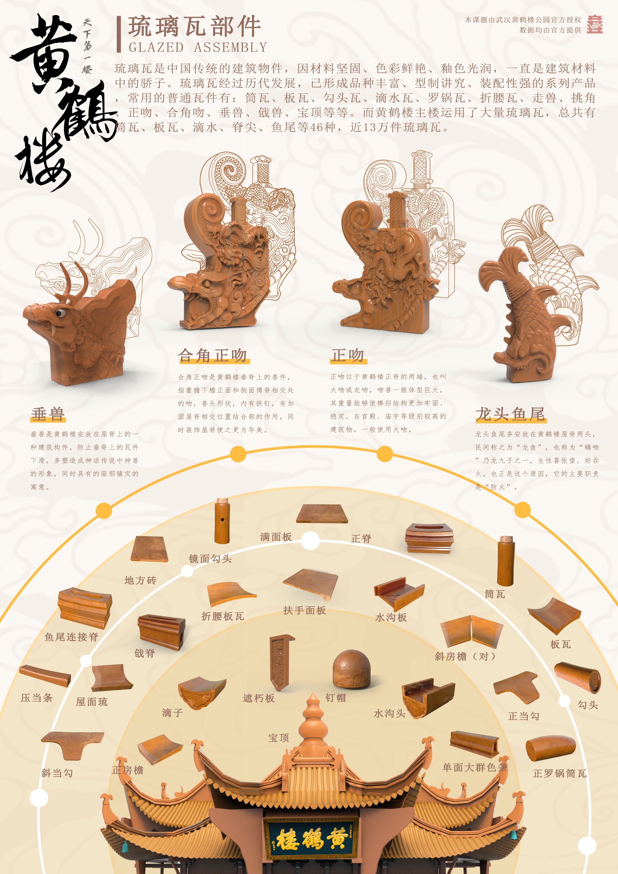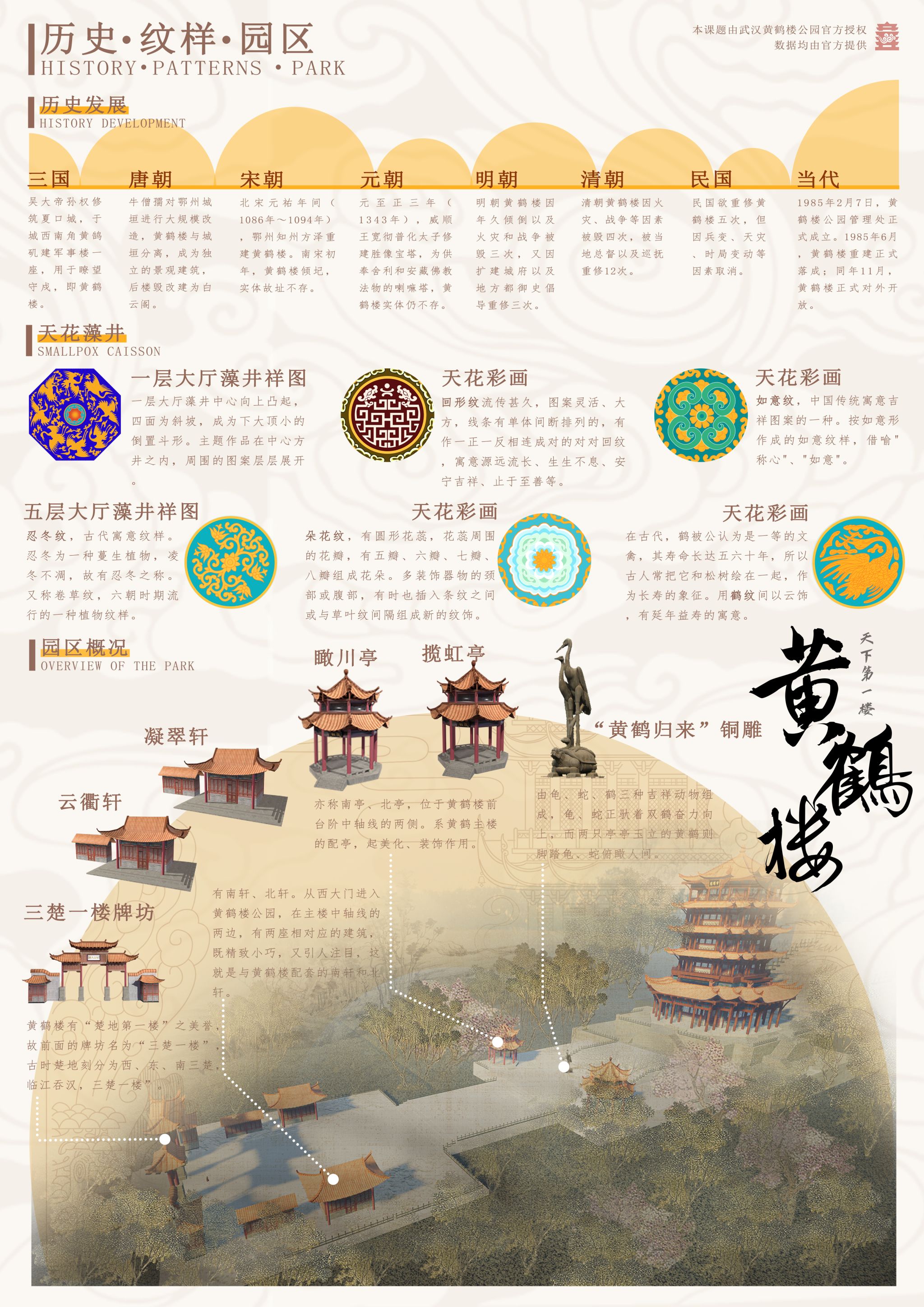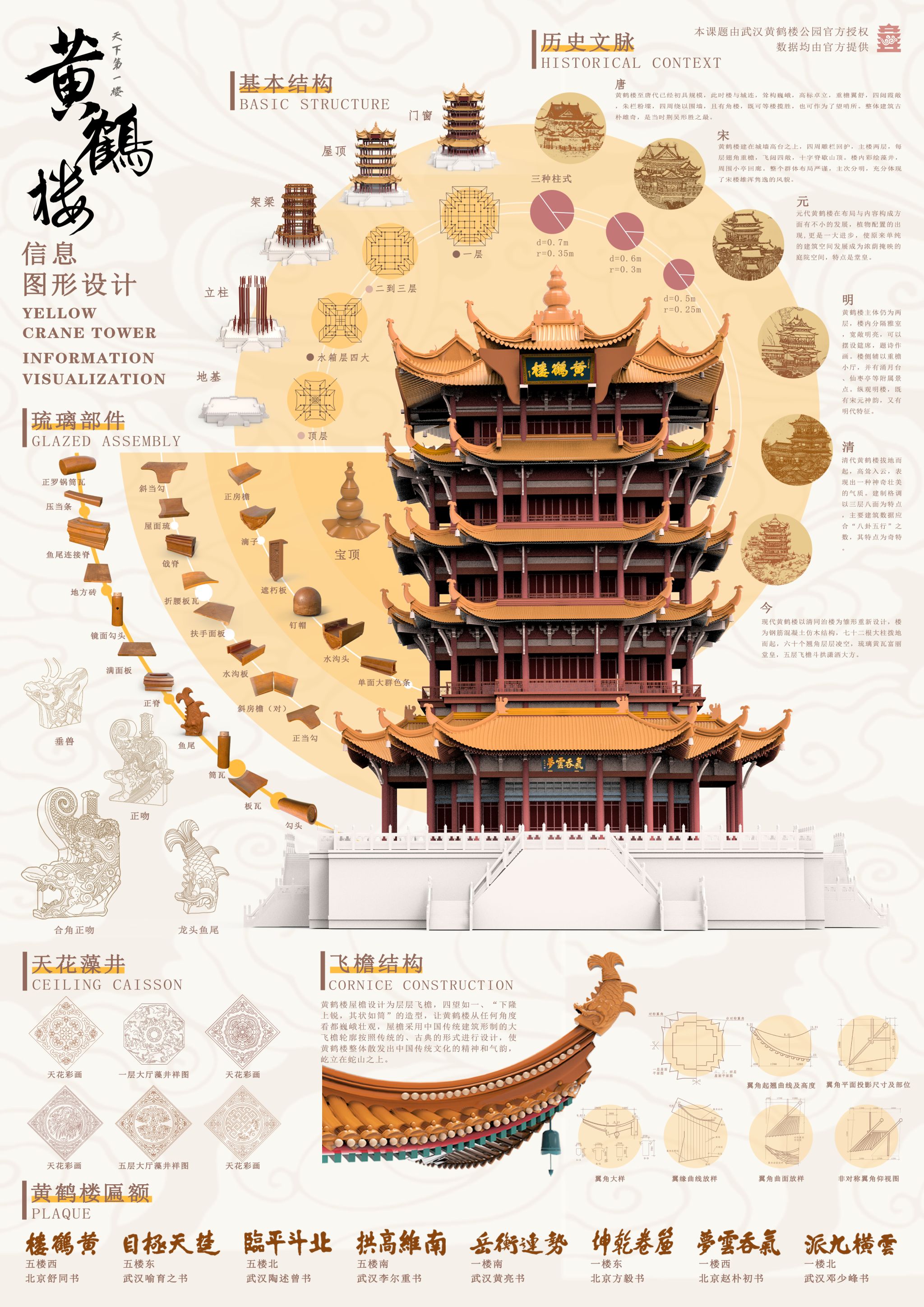 疫情后时代,武汉抗疫,无疑是一场宏大的史诗,这场战役让世界了解了武汉,而因武汉让世界人民认识了黄鹤楼。而黄鹤楼本身的浓郁的文化气息,让世界也为之赞叹。黄鹤楼逐渐成为与国际化接轨的形象。所以,为了让大家更加了解黄鹤楼,以及弘扬和宣传黄鹤楼文化,向世界展示黄鹤楼。所以本作品通过信息图形化设计的方式,用更加立体的手法,去诠释黄鹤楼,通过对黄鹤楼的历史文化,建筑结构,飞檐结构,图示纹样,以及详细部件的归纳总结和深入分析和讲述使黄鹤楼跨越时空去展示自己矗立在科技所在的任何地方,让世界感受黄鹤楼。