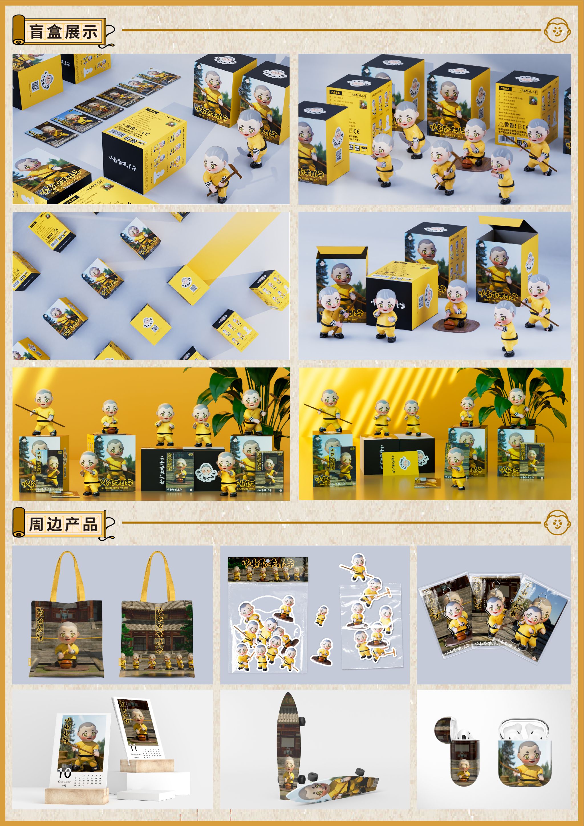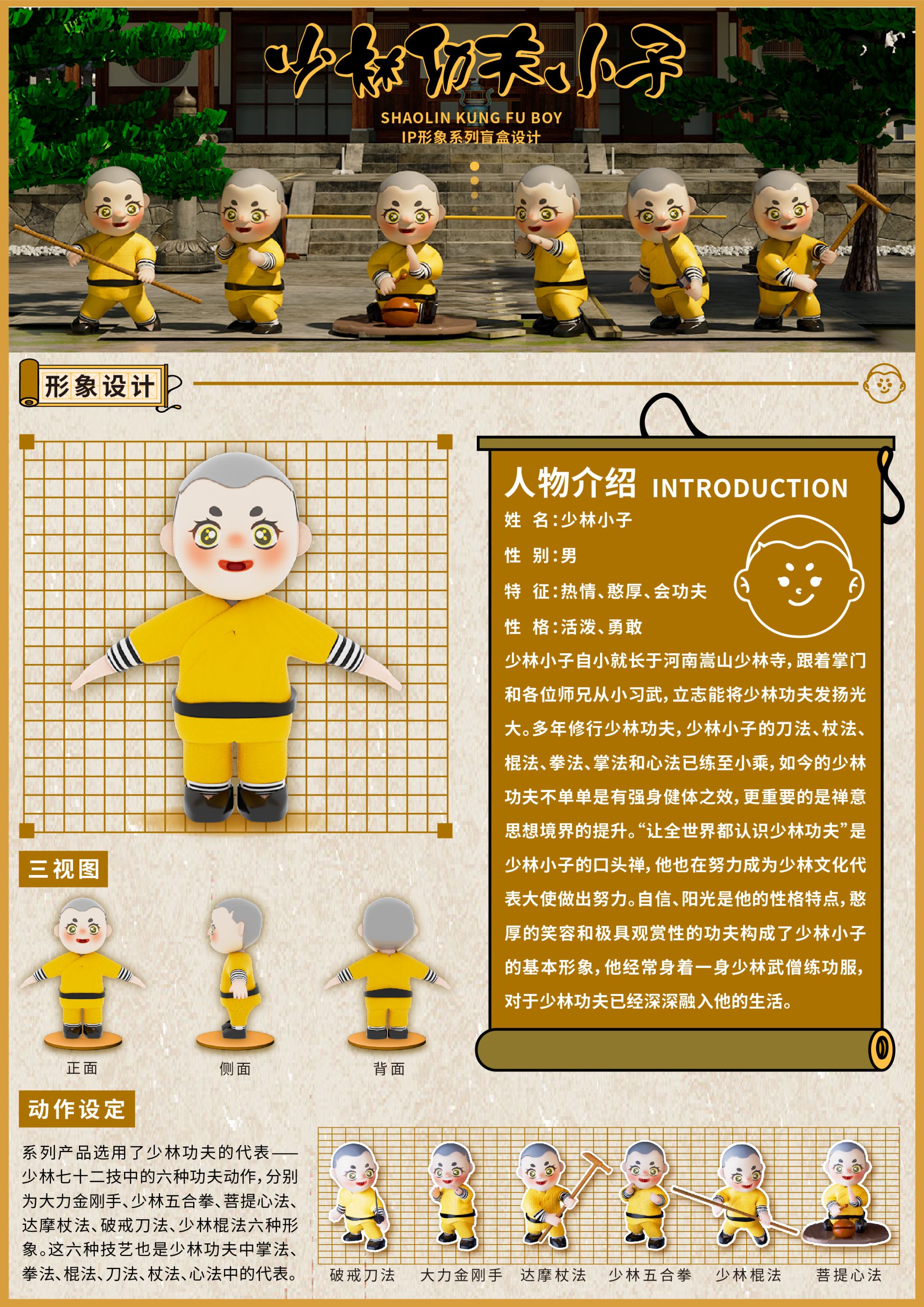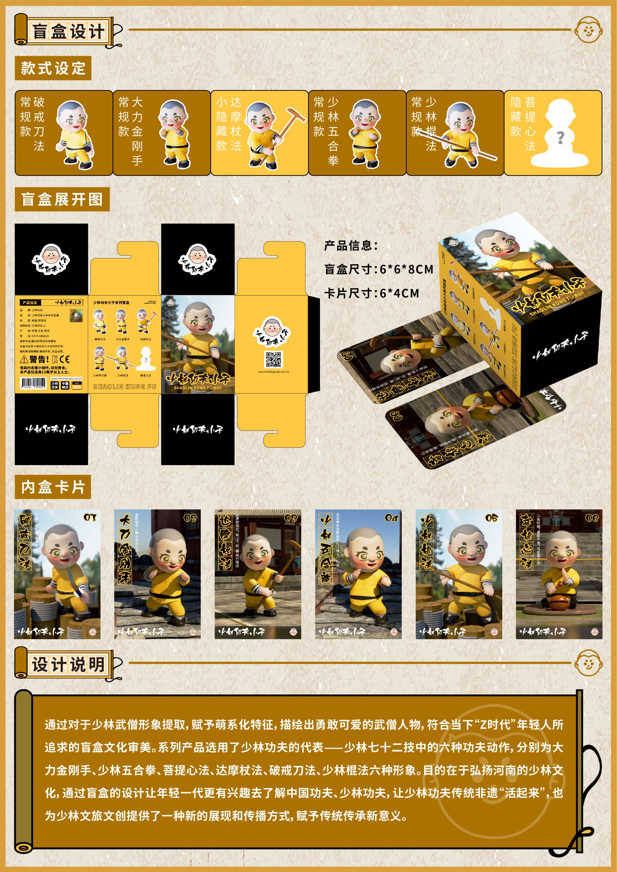 通过对于少林武僧形象提取,赋予萌系化特征,描绘出勇敢可爱的武僧人物,符合当下“Z时代”年轻人所追求的文化审美。系列产品选用了少林功夫的代表——少林七十二技中的六种功夫动作,分别为大力金刚手、少林五合拳、菩提心法、达摩杖法、破戒刀法、少林棍法六种形象。目的在于弘扬中国传统的功夫文化和少林文化,以盲盒IP的形式让人们更有兴趣去了解中国功夫、少林功夫,让少林功夫传统非遗“活起来”。为中国优秀传统文化提供了一种新的展现和传播方式,赋予传统传承新意义,助力中国品牌走向世界。