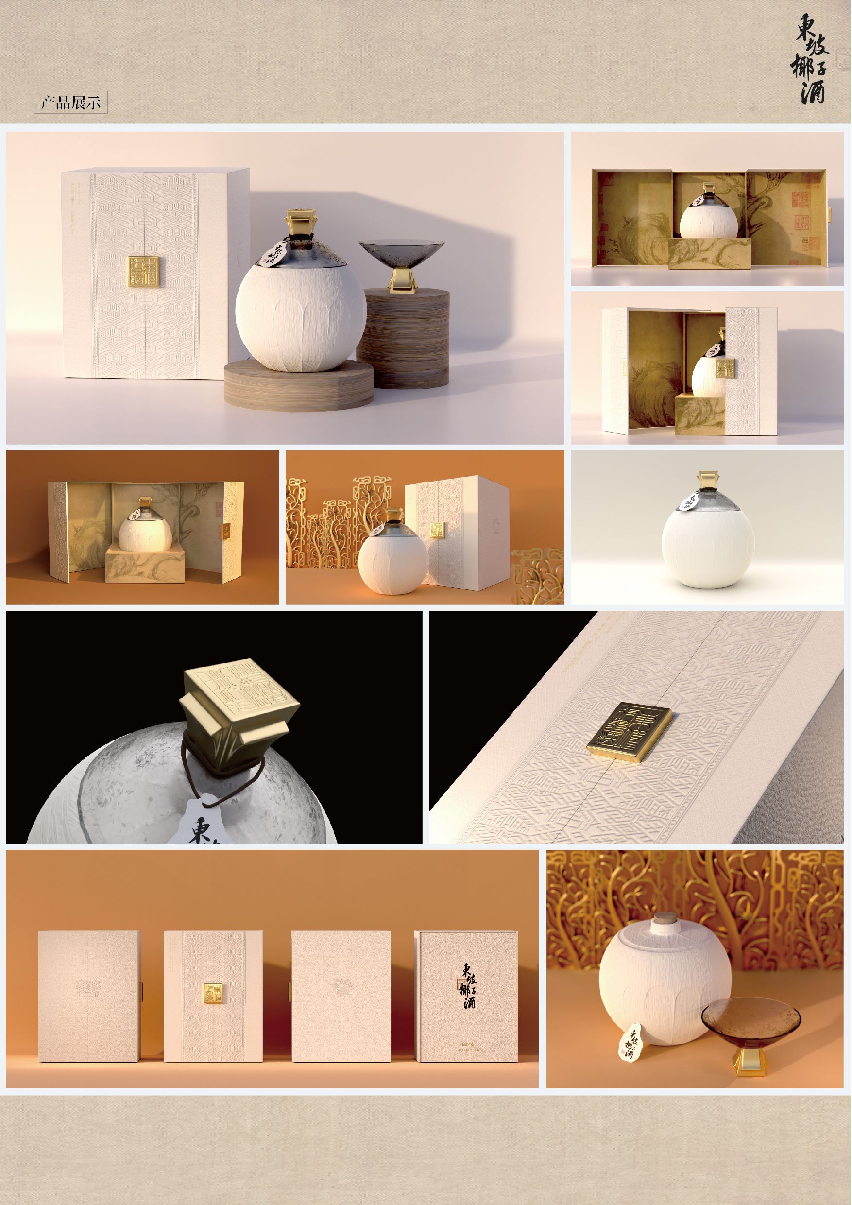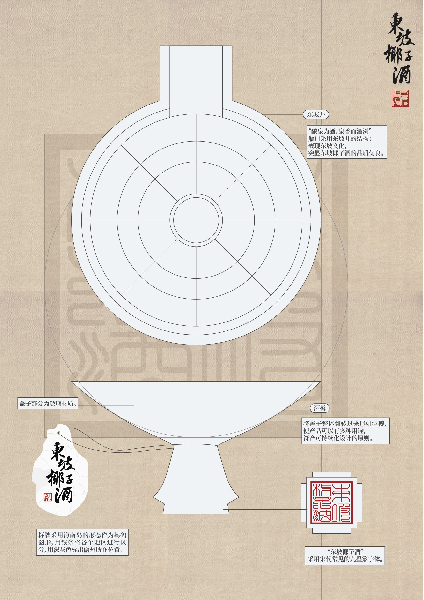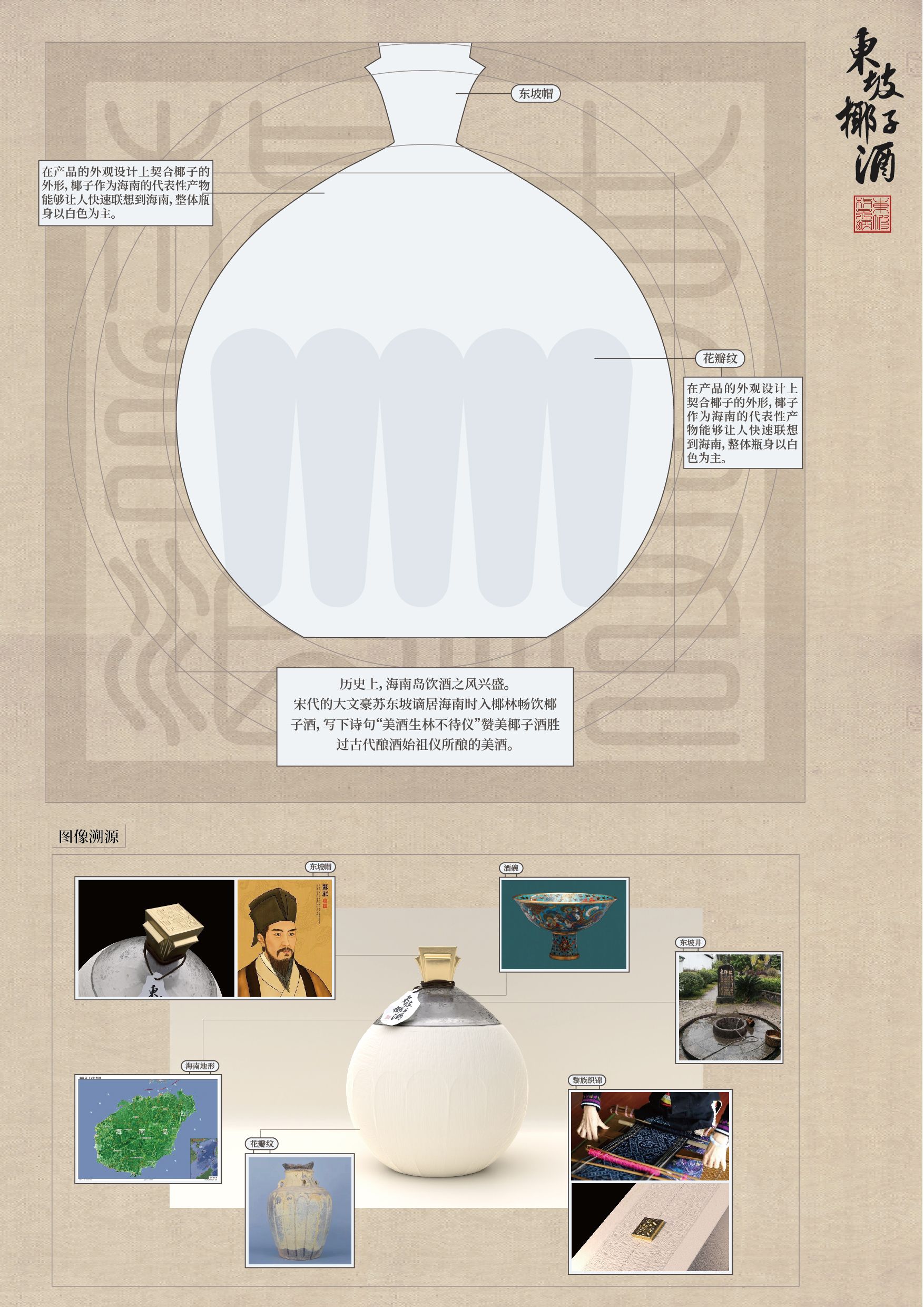 历史上,海南岛饮酒之风兴盛。宋代的大文豪苏东坡谪居海南时入椰林畅饮椰子酒,写下诗句“美酒生林不待仪”赞美椰子酒胜过古代酿酒始祖仪所酿的美酒。该作品将东坡文化符号应用在现代包装设计中,丰富了包装设计的文化内涵,使产品融入故事感、趣味性,并有效地弘扬、传承东坡文化。